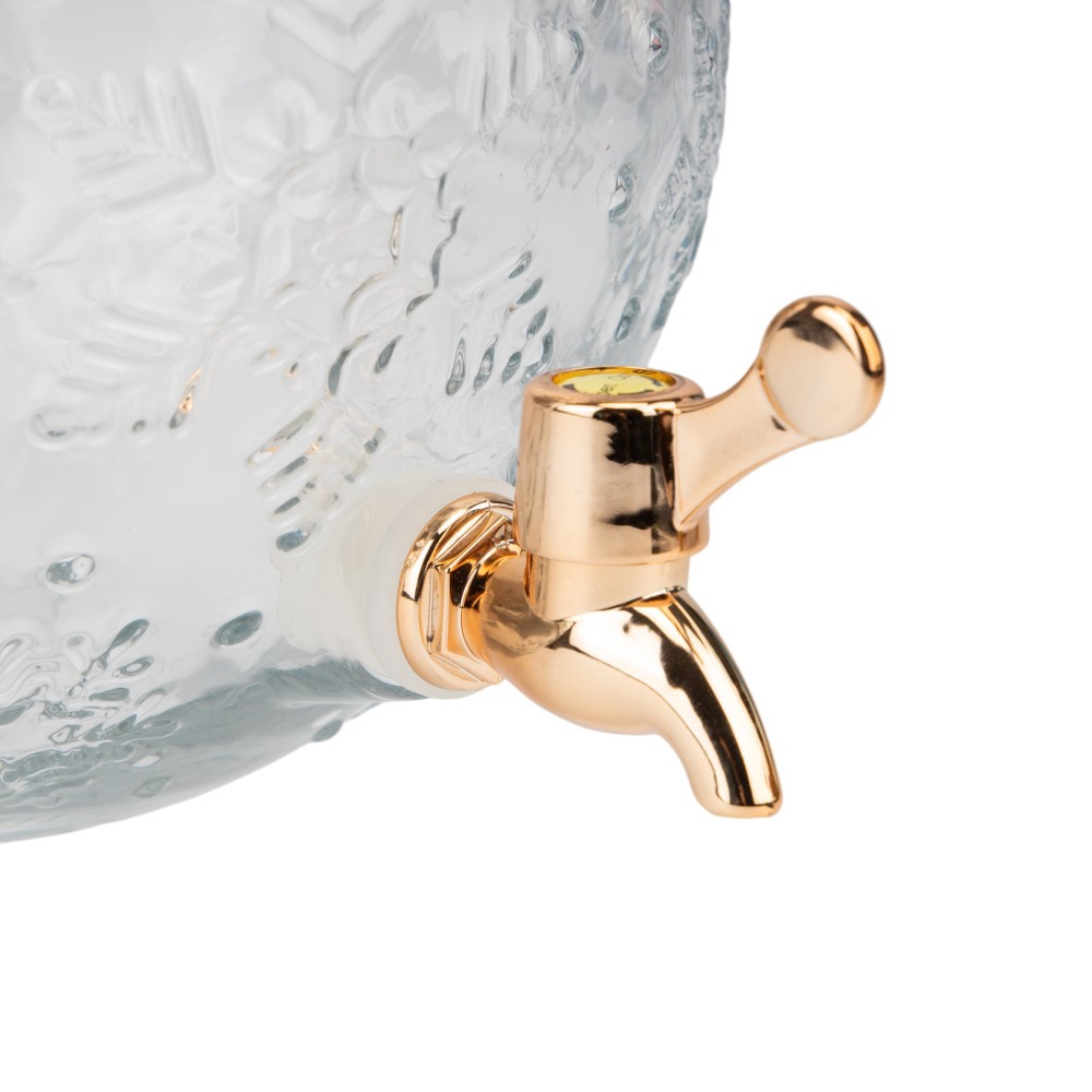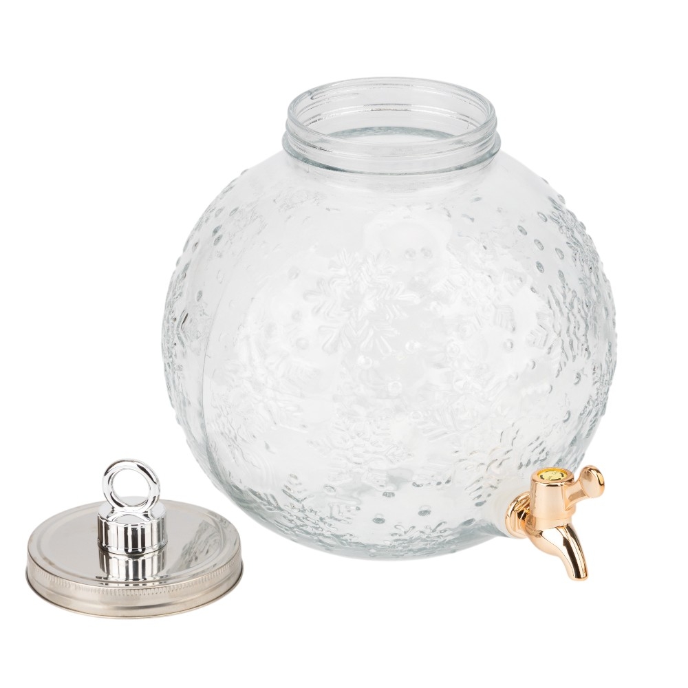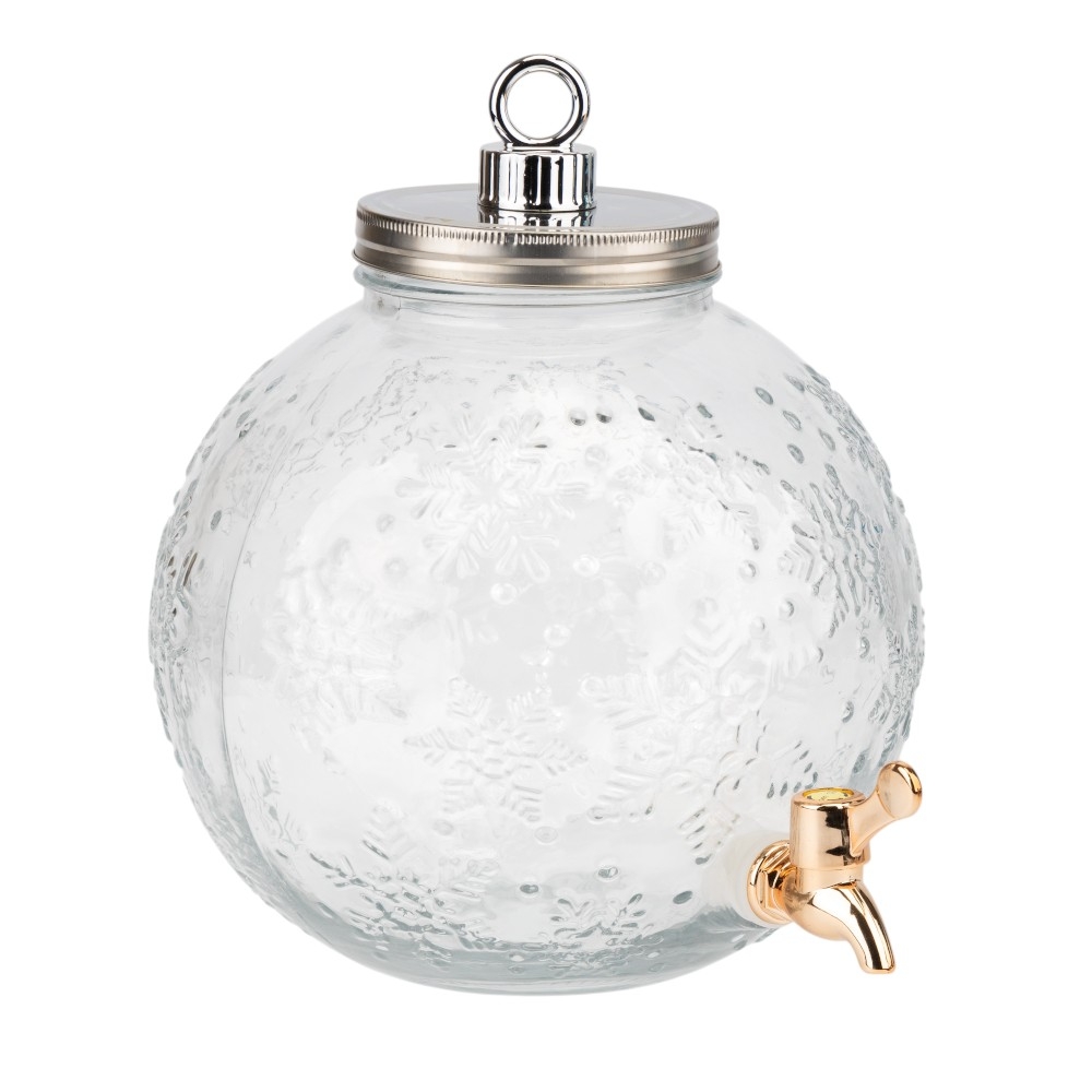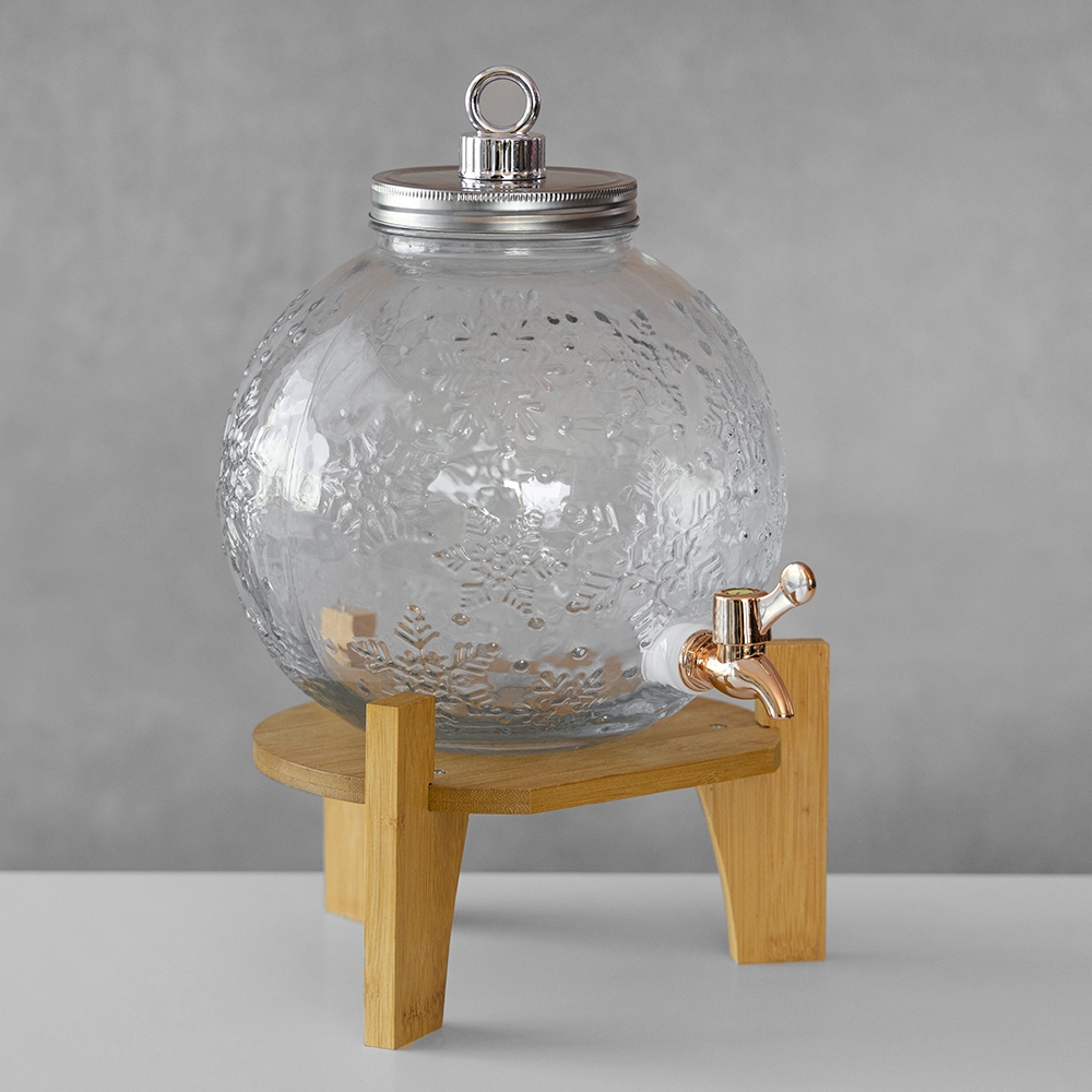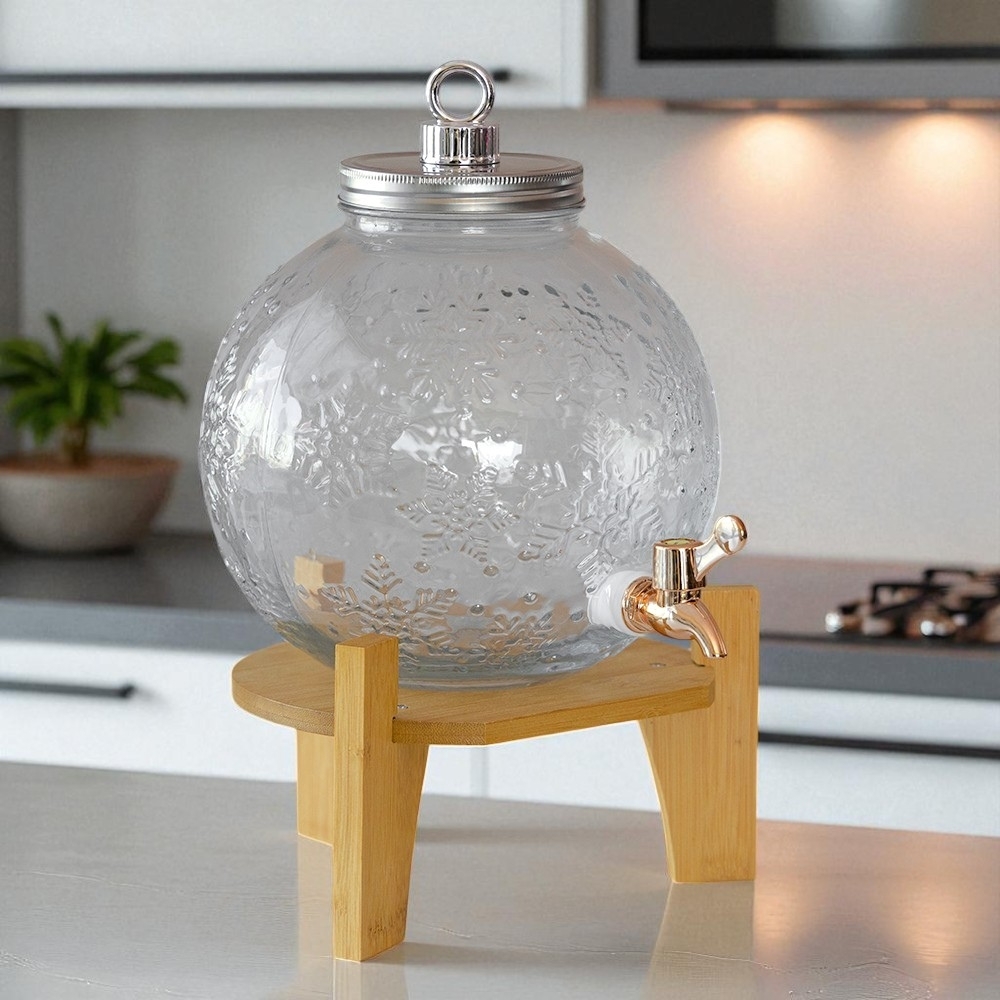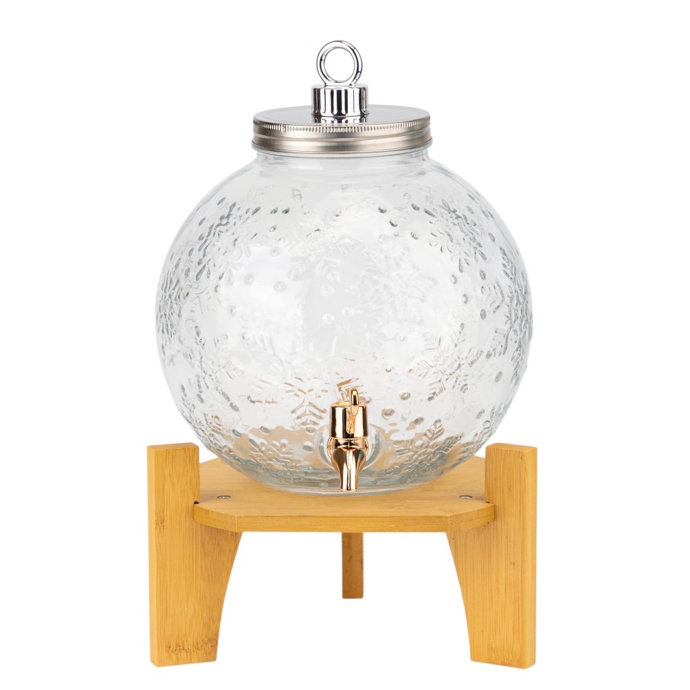 Висота - 28 см, діаметр - 23 см. Скляна лимонадниця зі сніжинками на бамбуковій підставці — це стильний та функціональний аксесуар для святкового столу. Об’ємна куляста форма прикрашена витонченим візерунком зі сніжинок, що створює зимову атмосферу та додає святковості. Натуральна бамбукова підставка забезпечує стійкість та зручність використання, а зручний кран дозволяє легко наливати напої. Ідеальний вибір для подачі лимонаду, глінтвейну чи інших напоїв під час свят, вечірок та заходів HoReCa.