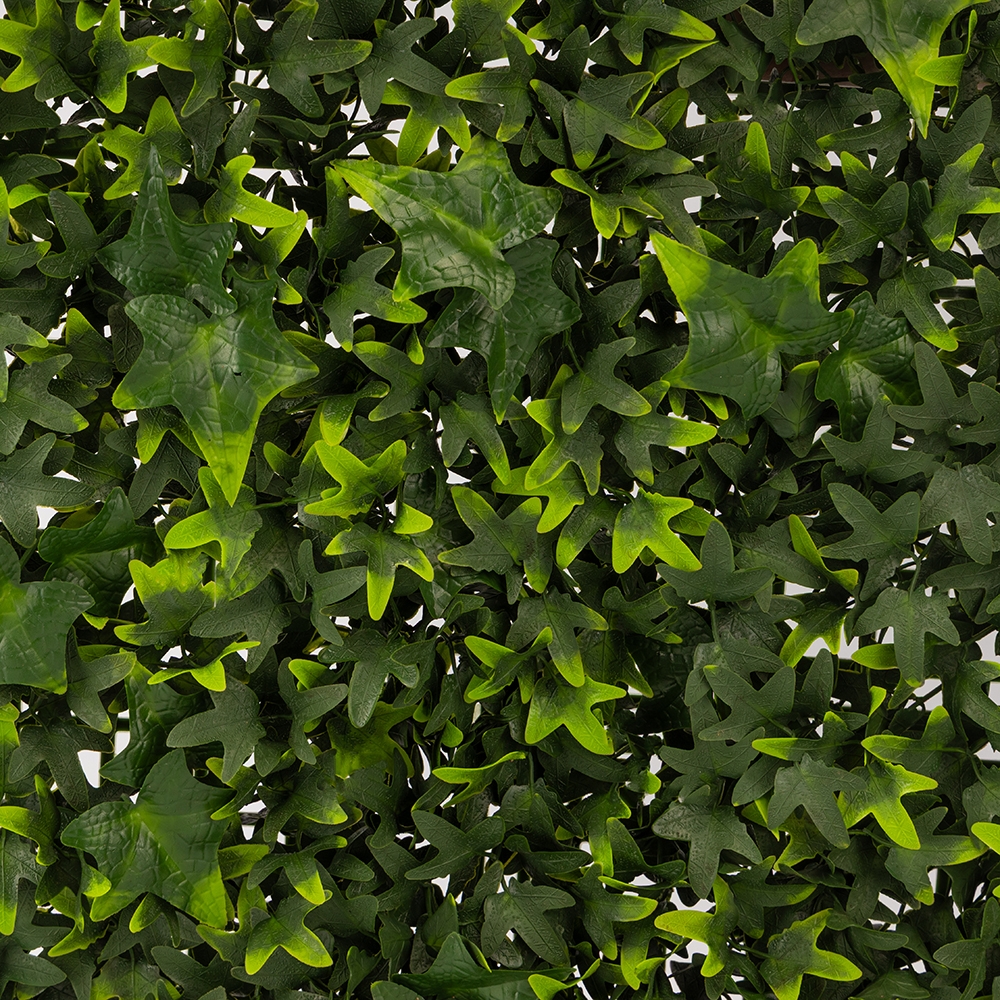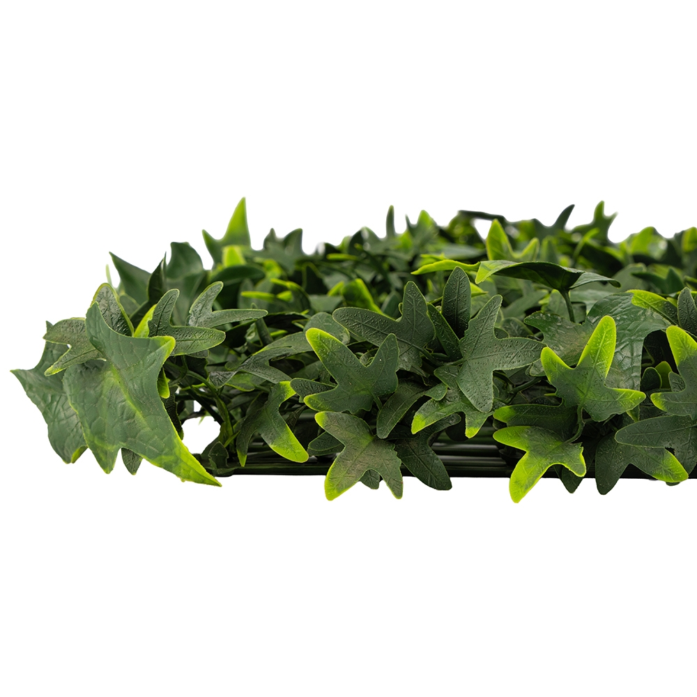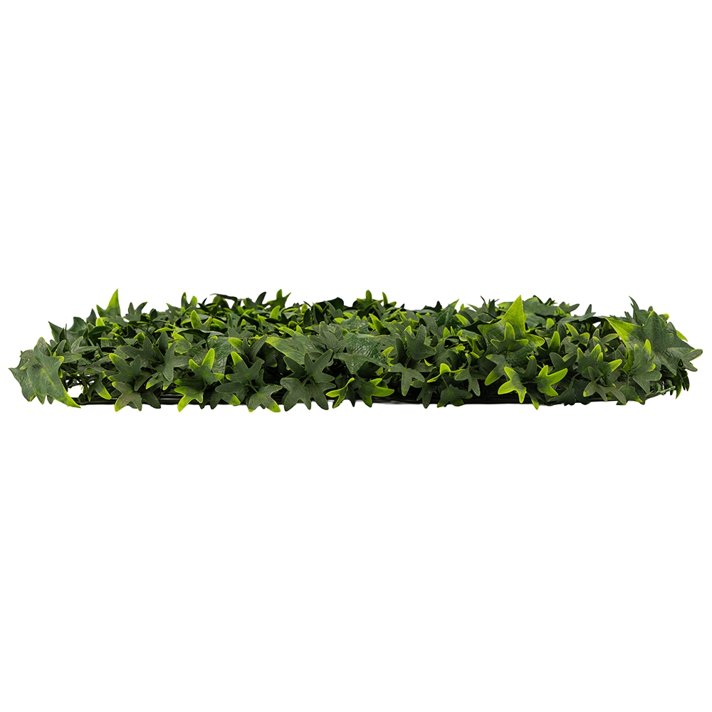Довжина та ширина панелі - 50 см. Декоративна панель зі штучної зелені "Плющ" імітує густе листя живої рослини та підходить для вертикального і горизонтального озеленення. Має пластикову основу з кліпсами по краях, що дозволяє легко з'єднувати кілька панелей у велику конструкцію. Використовується для декору інтер'єрів, терас, фотозон, вітрин або зон відпочинку. Підходить для монтажу в приміщенні та на вулиці під накриттям.