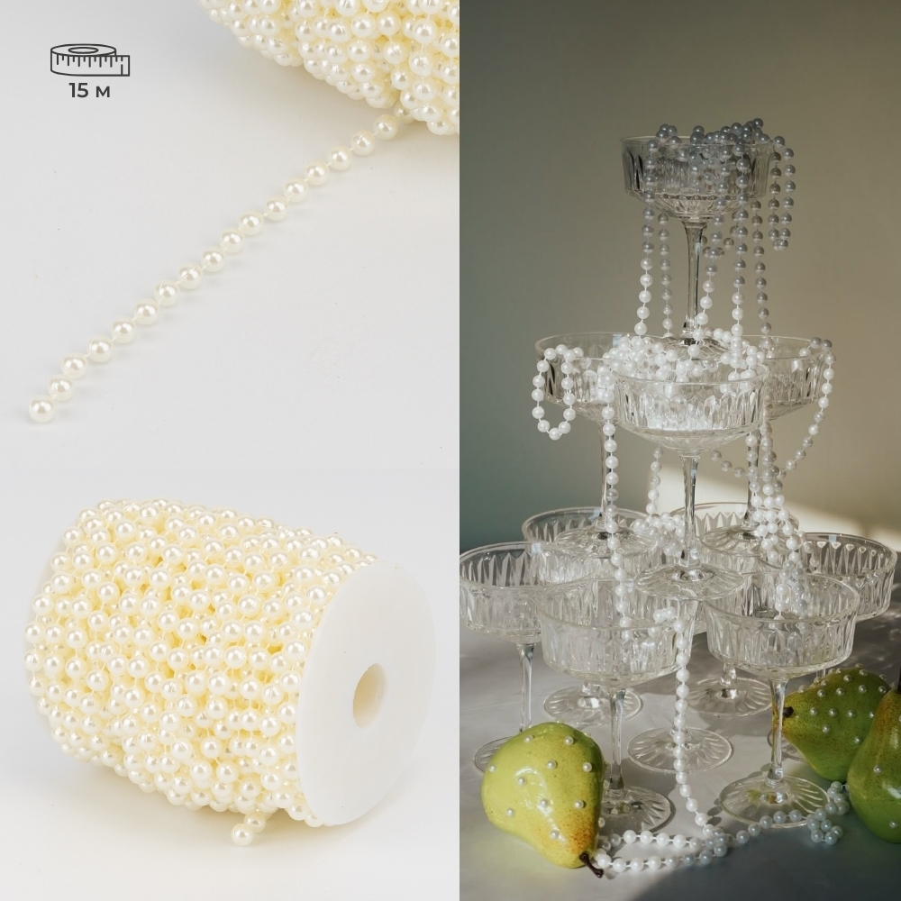 Довжина - 15 метрів. Декоративна гірлянда з перлин — стильний елемент для святкового оздоблення та інтер’єрного декору. Вона ідеально підходить для оформлення весілля, дня народження, фотозони, святкового столу чи вітрини. Гірлянда легко ріжеться на відрізки потрібної довжини та гармонійно поєднується з квітковими композиціями, свічками, текстилем та іншими декоративними елементами. Це універсальне рішення, яке додає вишуканості будь-якому святу чи інтер’єру.