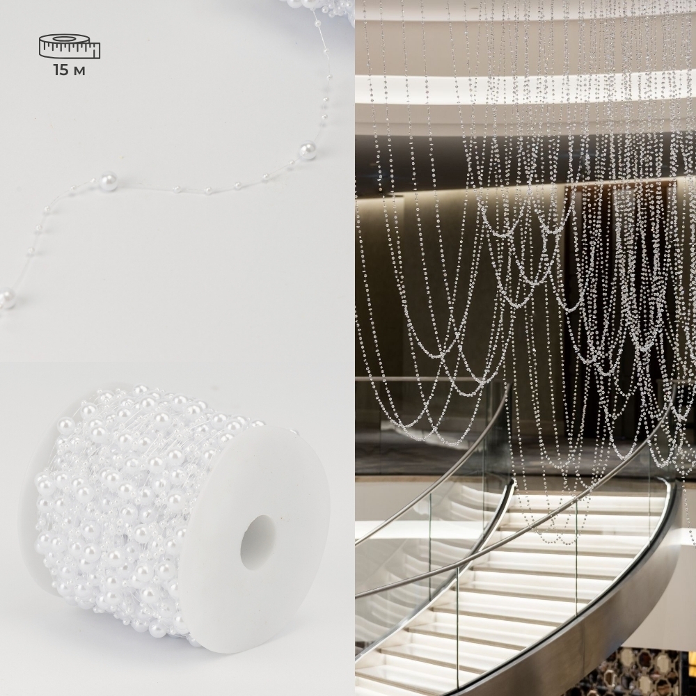 Довжина - 15 метрів. Декоративна гірлянда з перлин на волосіні — стильний елемент для святкового оздоблення та інтер’єрного декору. Вона ідеально підходить для оформлення весілля, дня народження, фотозони, святкового столу чи вітрини. Завдяки прозорій основі здається, що намистини ніби ширяють у повітрі, створюючи витончений і легкий ефект. Гірлянда легко ріжеться на відрізки потрібної довжини та гармонійно поєднується з квітковими композиціями, свічками, текстилем та іншими декоративними елементами. Це універсальне рішення, яке додає вишуканості будь-якому святу чи інтер’єру.