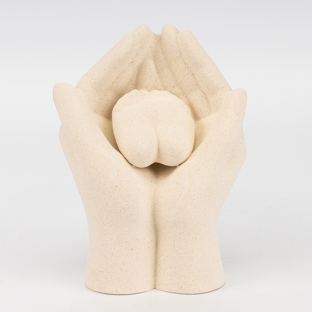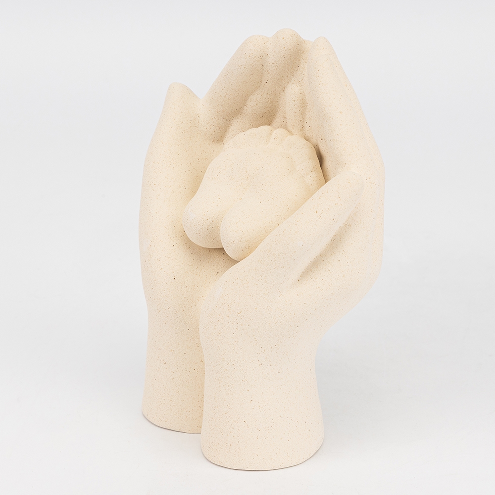 Висота статуетки — 17 см, довжина — 15 см, ширина — 7 см. Декоративна статуетка "Ніжки в долонях" викликає неймовірне захоплення своєю елегантною формою, яка символізує зародження життя, материнство чи батьківство та безмежну турботу. Скульптура турботи та захисту — це креативний декор для Вашої оселі, дитячої кімнати, фотостудії чи кафе. Також це чудовий, глибоко символічний подарунок для майбутніх батьків. Статуетка має вишуканий зовнішній вигляд та мінімалістичний дизайн. Вона виготовлена з високоякісного матеріалу — кераміки, має ніжний, піщано—бежевий колір та приємну текстурну обробку. Статуетка викликатиме приємні емоції та трепетні спогади про найцінніше.