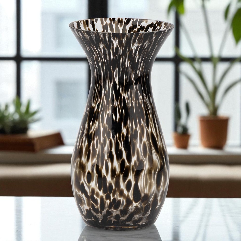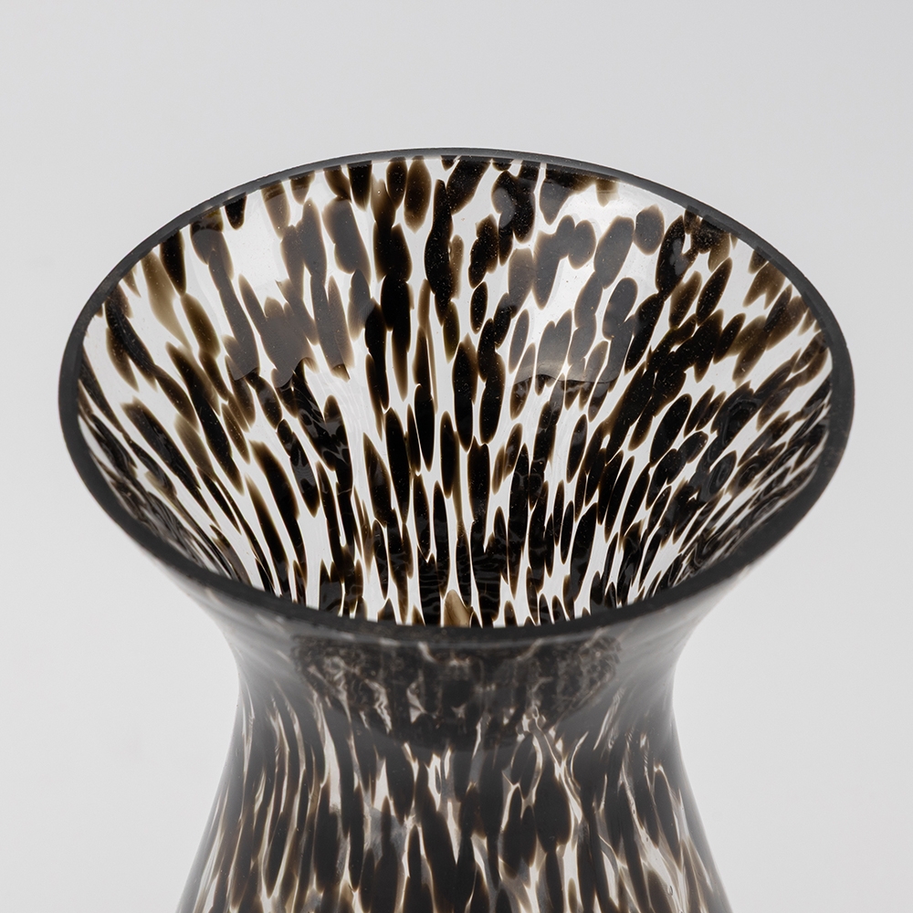 Висота - 24 см, діаметр - 11 см. Діаметр горлечка - 13 см. Ця скляна ваза виконана в унікальній техніці з ефектом краплин та плавних переходів кольору. Вона поєднує елегантність ручної роботи й сучасний дизайн, стаючи яскравим акцентом у будь-якому інтер’єрі. Завдяки своїй формі та візерунку, ваза підкреслює красу квіткових композицій або може слугувати самостійним декоративним елементом. Така ваза ідеально пасує для дому, ресторанів, готелів чи стильних фотозон.