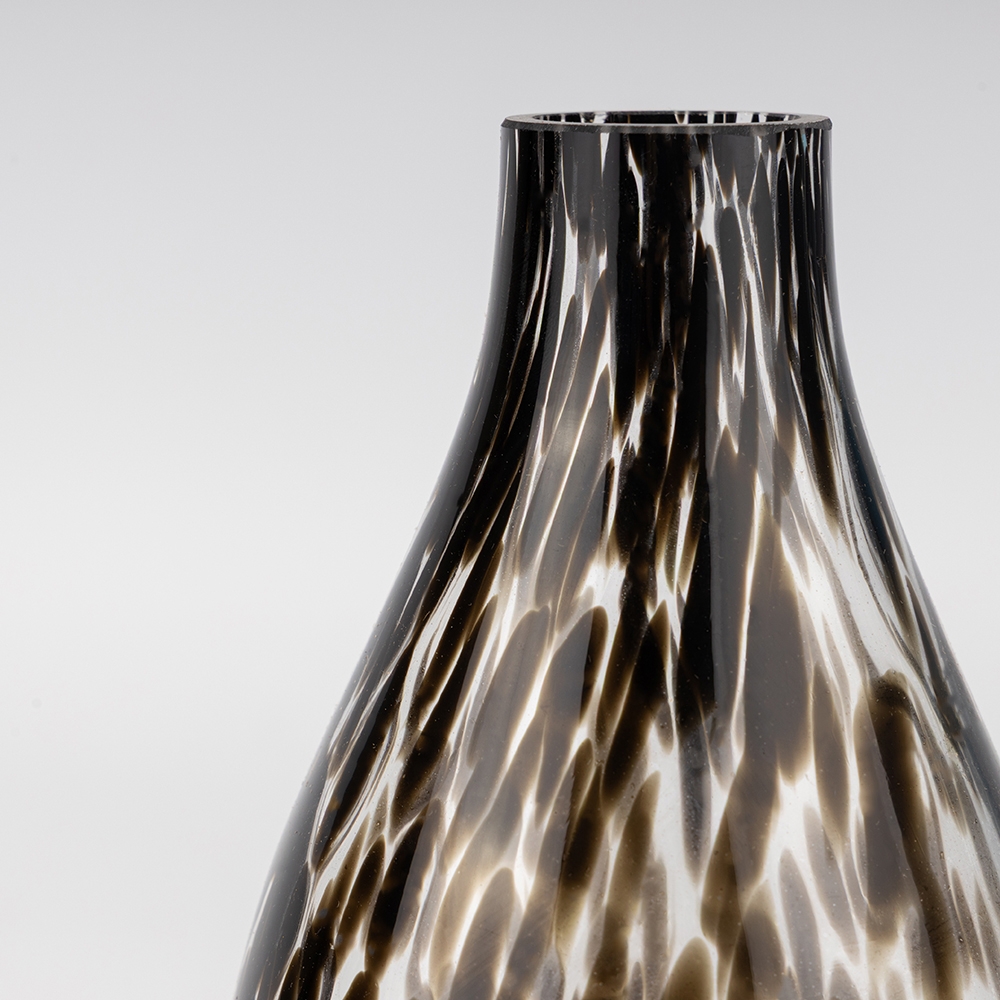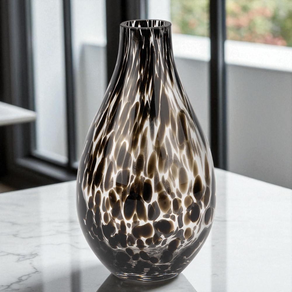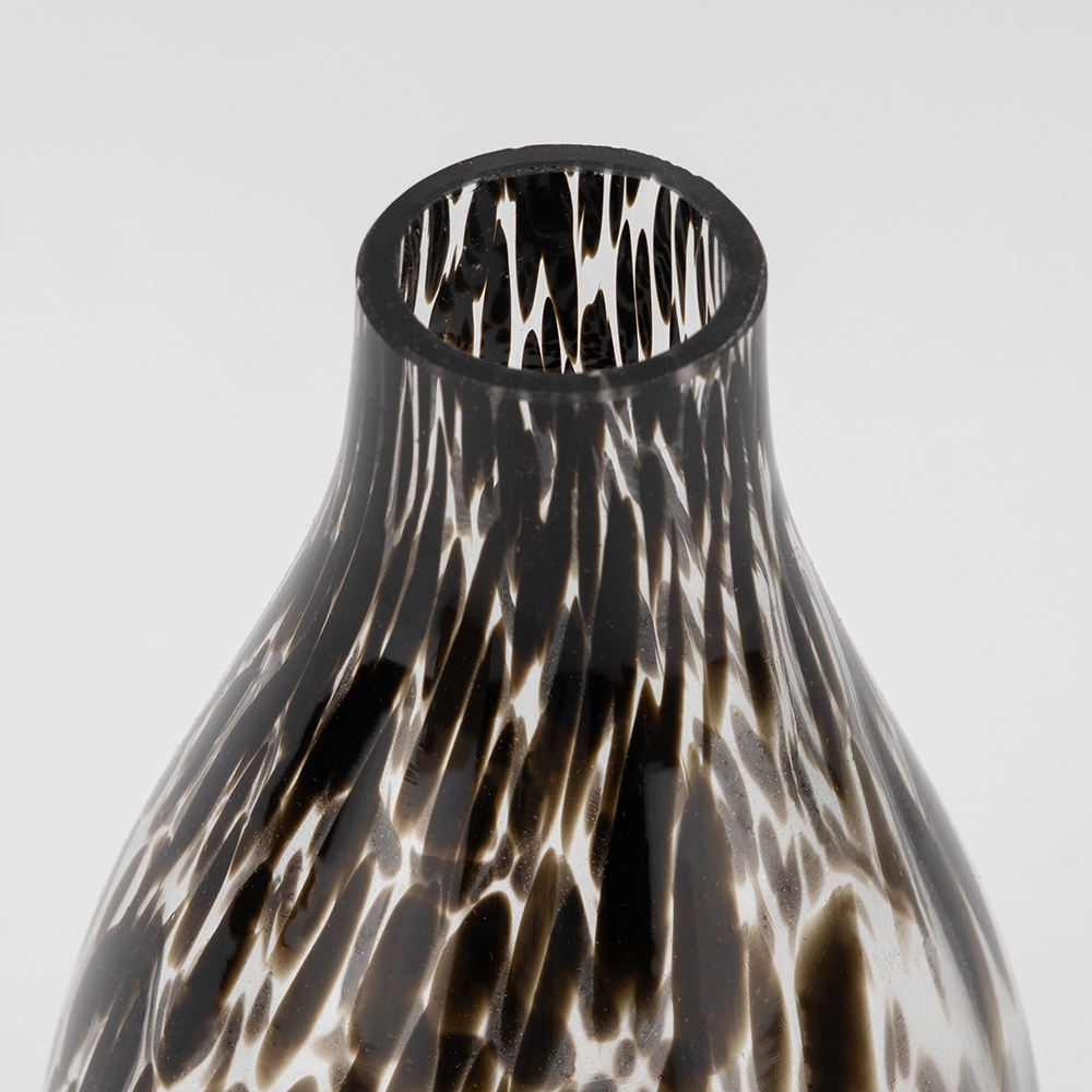 Висота - 19 см, Діаметр - 10 см. Діаметр горлечка - 4 см. Ця скляна ваза виконана в унікальній техніці з ефектом краплин та плавних переходів кольору. Вона поєднує елегантність ручної роботи й сучасний дизайн, стаючи яскравим акцентом у будь-якому інтер’єрі. Завдяки своїй формі та візерунку, ваза підкреслює красу квіткових композицій або може слугувати самостійним декоративним елементом. Така ваза ідеально пасує для дому, ресторанів, готелів чи стильних фотозон.