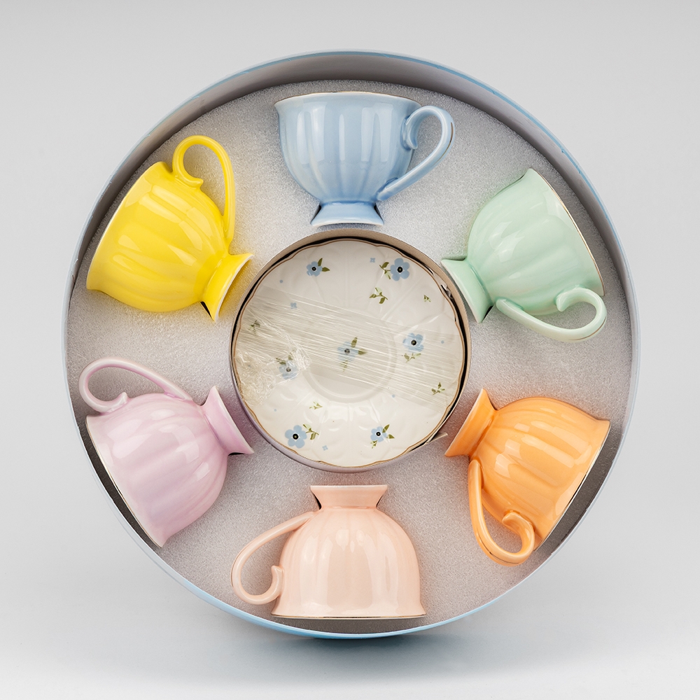 Розмір коробки: діаметр - 36 см, висота - 10 см. Чашка: діаметр - 9,5 см, висота - 6,5 см, об'єм - 230 мл. Блюдце: діаметр - 15 см. Запакована в подарункову коробку. Набір чашок та блюдець на 6 персон – стильне рішення для створення затишної атмосфери за вашим столом. У комплект входить 6 чашок та 6 блюдець, виконаних із матеріалу високої якості, що забезпечує довговічність і зручність у використанні. Цей набір стане чудовим подарунком або стильним доповненням до вашого кухонного посуду.