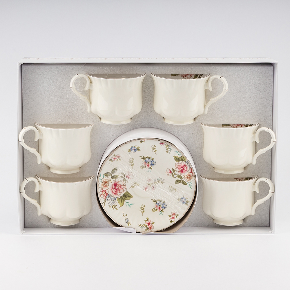 Розмір коробки: довжина - 41 см, висота - 10 см, ширина - 28 см. Чашка: діаметр - 9 см, висота - 8 см, об'єм - 260 мл. Блюдце: діаметр - 15 см. Запакована в подарункову коробку. Набір чашок та блюдець на 6 персон – стильне рішення для створення затишної атмосфери за вашим столом. У комплект входить 6 чашок та 6 блюдець, виконаних із матеріалу високої якості, що забезпечує довговічність і зручність у використанні. Цей набір стане чудовим подарунком або стильним доповненням до вашого кухонного посуду.