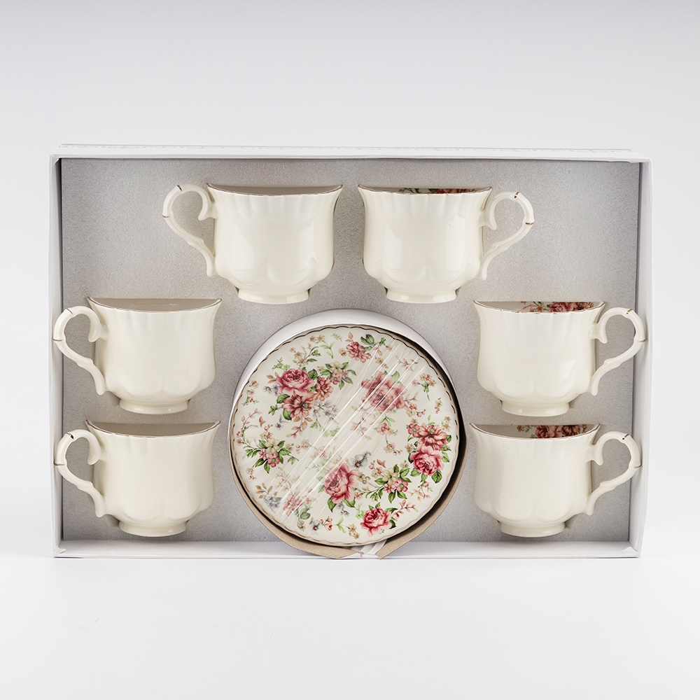 Розмір коробки: довжина - 41 см, висота - 10 см, ширина - 28 см. Чашка: діаметр - 9 см, висота - 8 см, об'єм - 260 мл. Блюдце: діаметр - 15 см. Запакована в подарункову коробку. Набір чашок та блюдець на 6 персон – стильне рішення для створення затишної атмосфери за вашим столом. У комплект входить 6 чашок та 6 блюдець, виконаних із матеріалу високої якості, що забезпечує довговічність і зручність у використанні. Цей набір стане чудовим подарунком або стильним доповненням до вашого кухонного посуду.