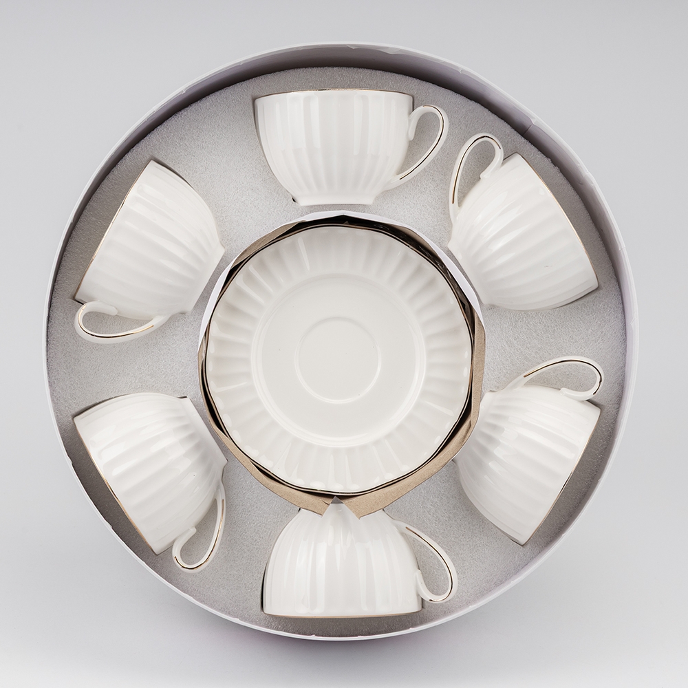 Розмір коробки: діаметр - 36 см, висота - 10 см. Чашка: діаметр - 9,5 см, висота - 6,5 см, об'єм - 230 мл. Блюдце: діаметр - 15 см. Запакована в подарункову коробку. Набір чашок та блюдець на 6 персон – стильне рішення для створення затишної атмосфери за вашим столом. У комплект входить 6 чашок та 6 блюдець, виконаних із матеріалу високої якості, що забезпечує довговічність і зручність у використанні. Цей набір стане чудовим подарунком або стильним доповненням до вашого кухонного посуду.
