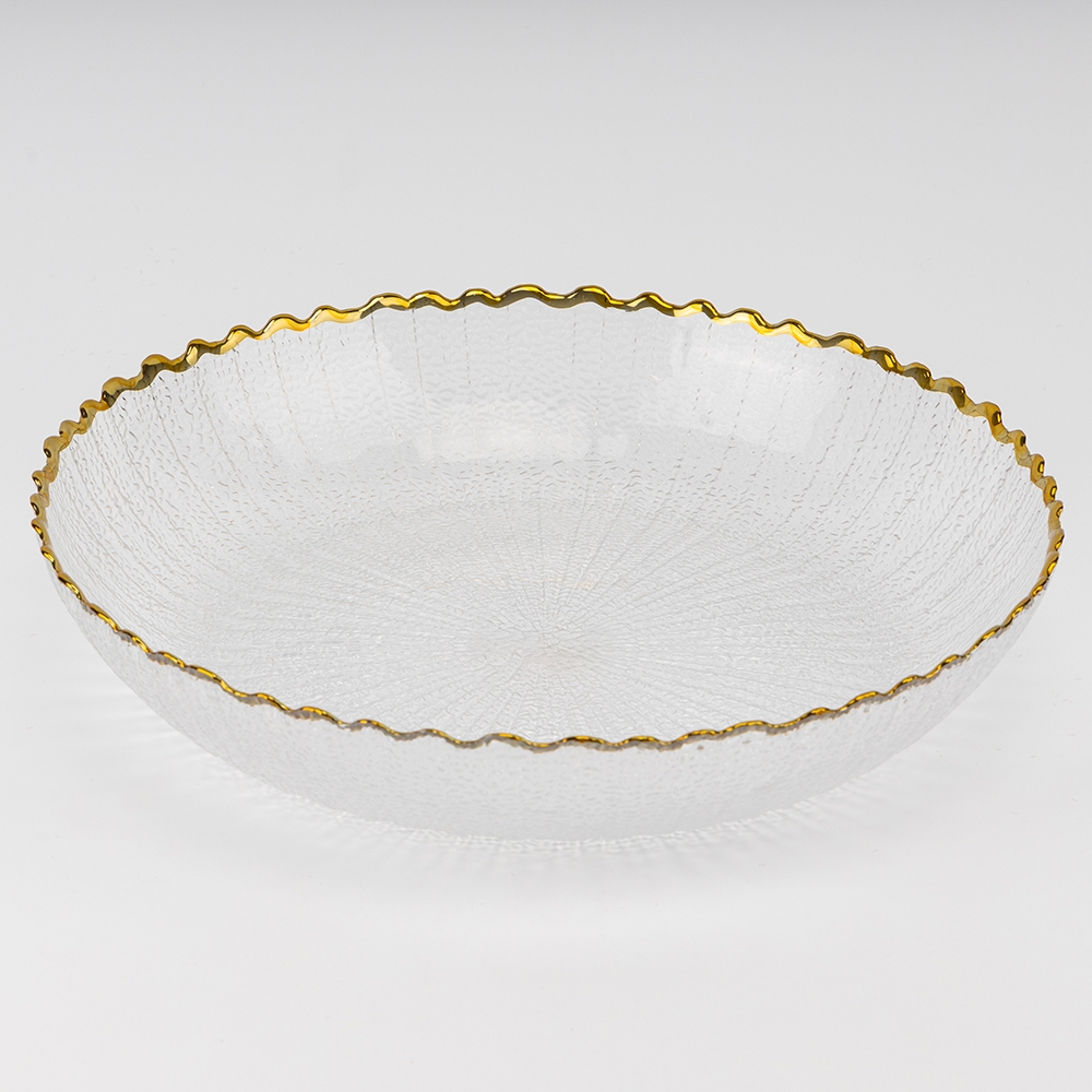 Зверніть увагу, що внаслідок недавньої атаки дронів частина партії має незначний аромат гарі, який повністю вивітрюється протягом короткого часу. Діаметр - 33 см, висота - 6,5 см. Вишукане блюдо поєднує елегантність і сучасний стиль. Скло з хвилястими краями та витонченою окантовкою створює ефект розкішного сервірування. Таке блюдо стане акцентом святкового столу або доповненням до інтер’єру кафе чи ресторану. Ідеально підходить для подачі фруктів, десертів або закусок.