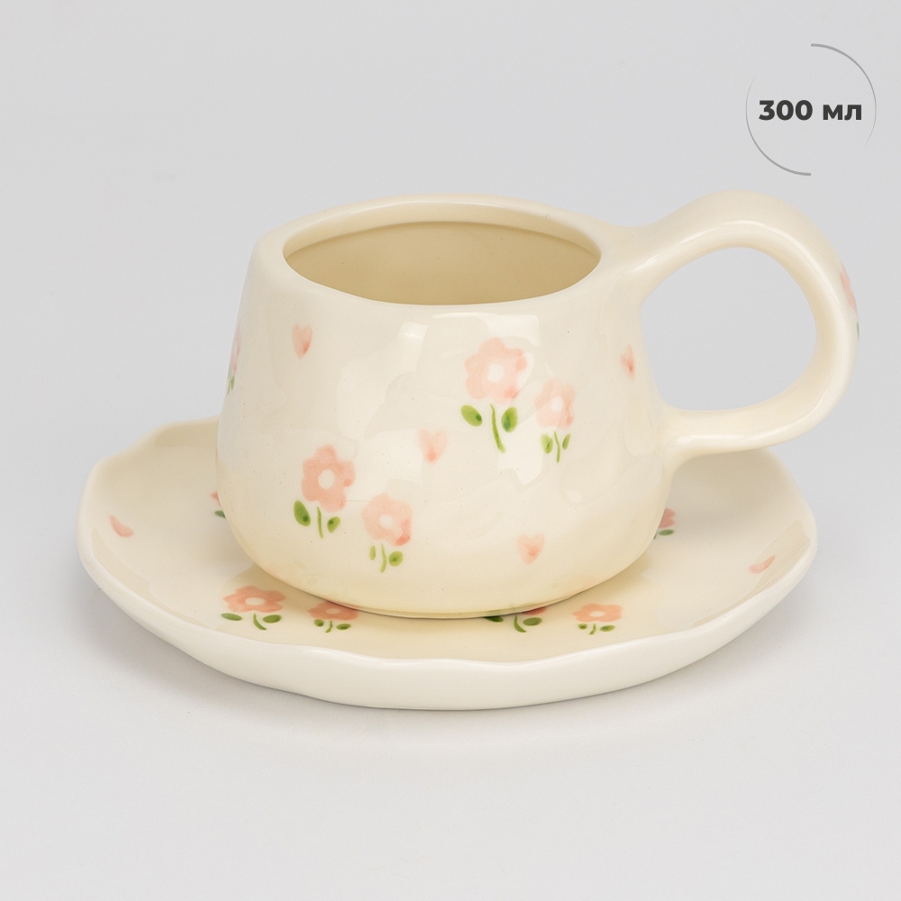 Діаметр тарілки – 15 см, об’єм чашки – 300 мл. Керамічна чашка з блюдцем з ніжним розписом створена вручну майстром. Кожна деталь — від форми до малюнка — дарує відчуття тепла й домашнього затишку. Завдяки оригінальному дизайну така чашка стане прикрасою святкового столу, стильним акцентом у кав’ярні чи ресторані, а також чудовим подарунком для близьких. Вона поєднує практичність і естетику, створюючи особливу атмосферу кожної трапези.