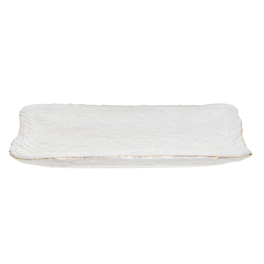 Длина – 23 см, ширина – 14 см, высота – 2 см. Стеклянное блюдо изящной прямоугольной формы с эффектом ручной работы. Оно выполнено из стекла высокого качества, что обеспечивает его прозрачность и прочность. Легкий рельеф на поверхности создает изысканную текстуру, а неровный край с золотой отделкой придает блюду особый шарм. Благодаря универсальному дизайну, такое блюдо станет идеальным выбором для сервировки закусок, десертов, суши или фруктов. Оно гармонично впишется как в праздничную, так и в повседневную сервировку, добавляя нотку роскоши любому столу.