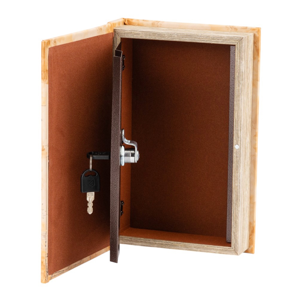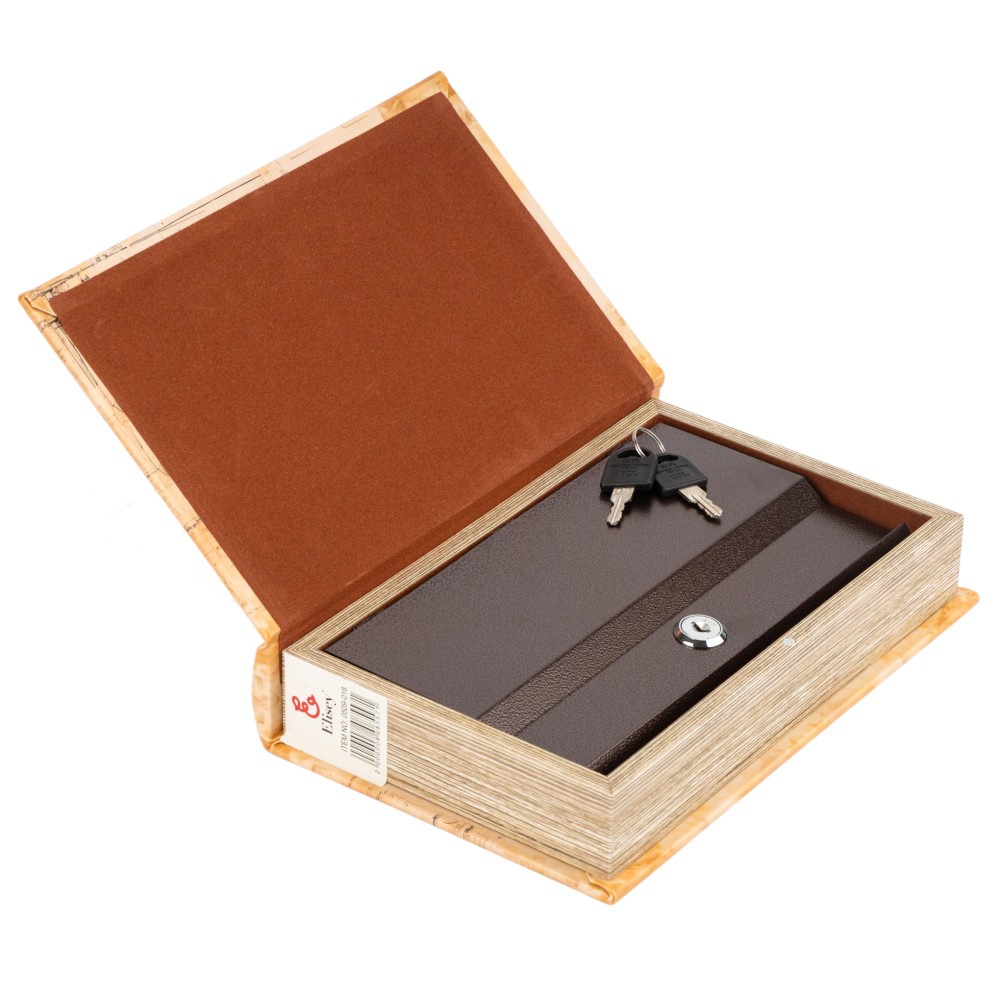 Высота - 26 см, длина - 17 см, ширина - 5 см. Книга-сейф – это креативный интерьерный элемент, который выглядит как обычная книга, но фактически имеет внутреннее хранилище. Это скрытая система хранения денег, документов или других ценных вещей. Внутри сейф закрывается на замок компактными ключами, которые легко можно спрятать в укромном месте. Это не только функциональная и полезная в повседневной жизни вещь, но и непревзойденный, уникальный вид. Благодаря своему внешнему виду, книга-сейф легко вписывается в книжную полку и дополняет любой интерьер. Отличный подарок для друзей и коллег.