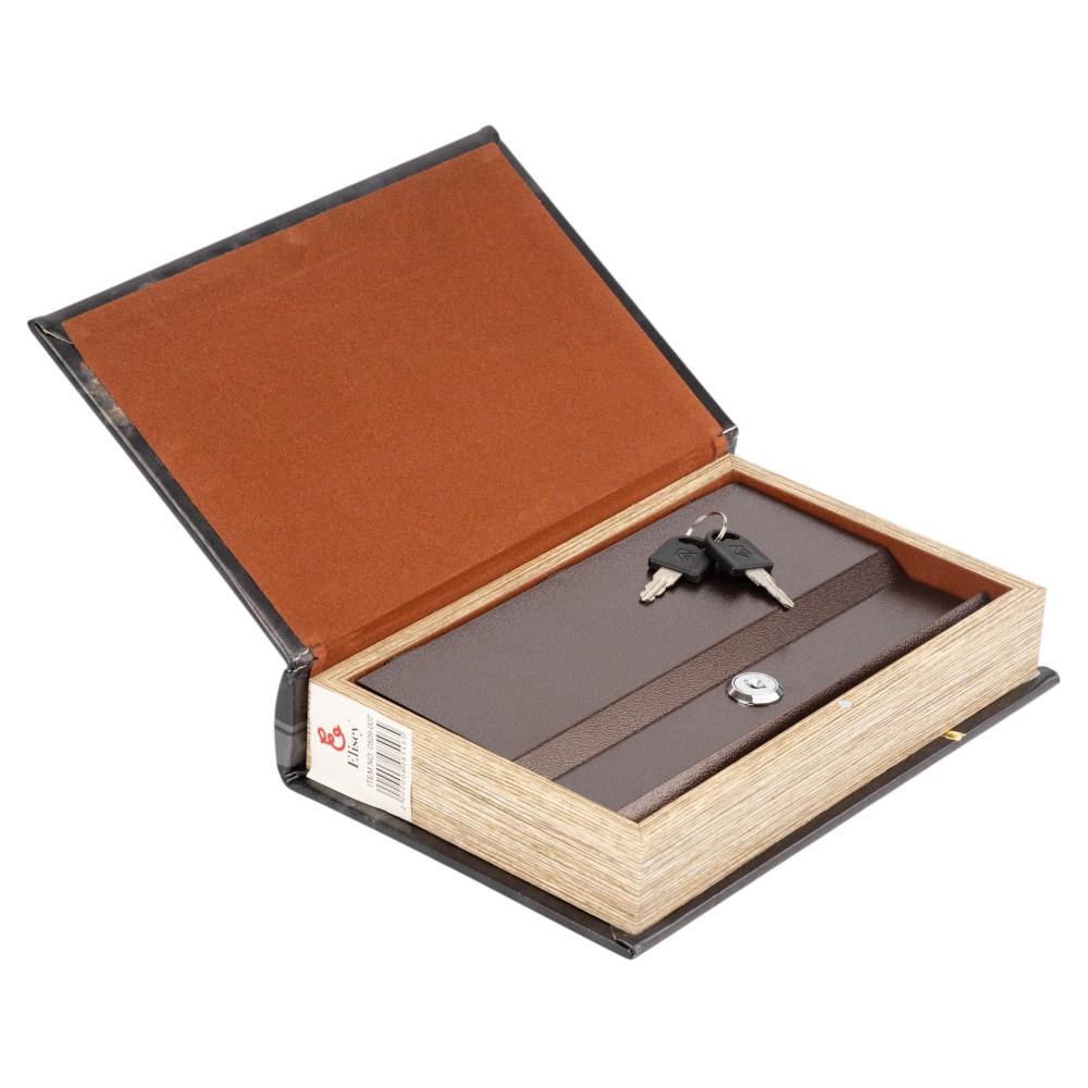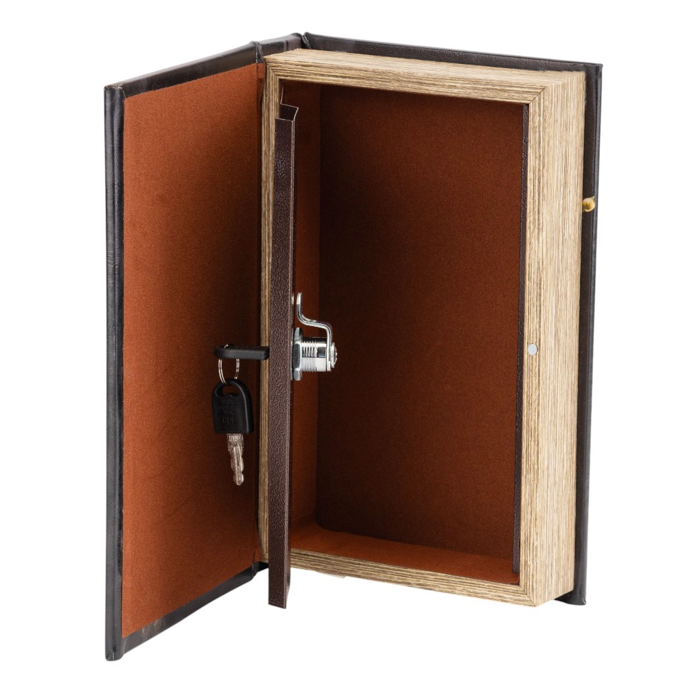 Высота - 26 см, длина - 17 см, ширина - 5 см. Книга-сейф – это креативный интерьерный элемент, который выглядит как обычная книга, но фактически имеет внутреннее хранилище. Это скрытая система хранения денег, документов или других ценных вещей. Внутри сейф закрывается на замок компактными ключами, которые легко можно спрятать в укромном месте. Это не только функциональная и полезная в повседневной жизни вещь, но и непревзойденный, уникальный вид. Благодаря своему внешнему виду, книга-сейф легко вписывается в книжную полку и дополняет любой интерьер. Отличный подарок для друзей и коллег.