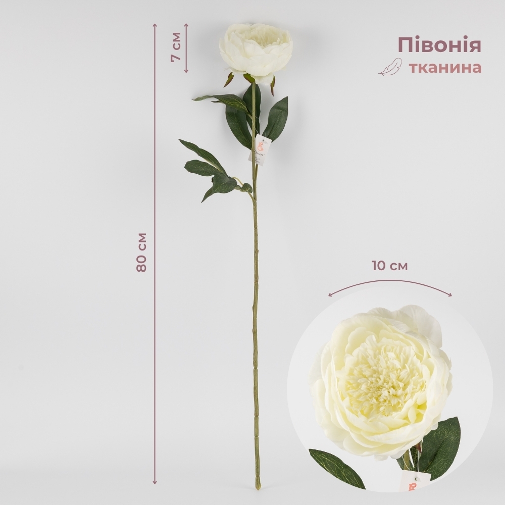 Высота - 80 см. Высота 1 бутона - 7 см, диаметр - 10 см. Цветы выполнены из ткани, стебли — из пластика. Искусственные пионы имеют детализированные листья и бутоны с природной текстурой и характерной формой. Гибкий стебель позволяет легко менять расположение и придавать цветку желаемую форму, что делает его удобным для оформления интерьеров и флористических композиций. Подходит для создания декоративных аранжировок, озеленения помещений и фотозон.