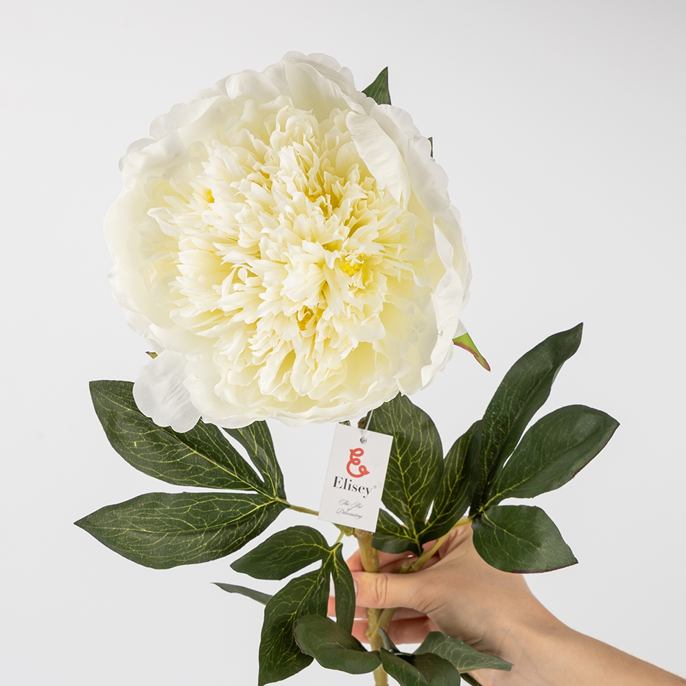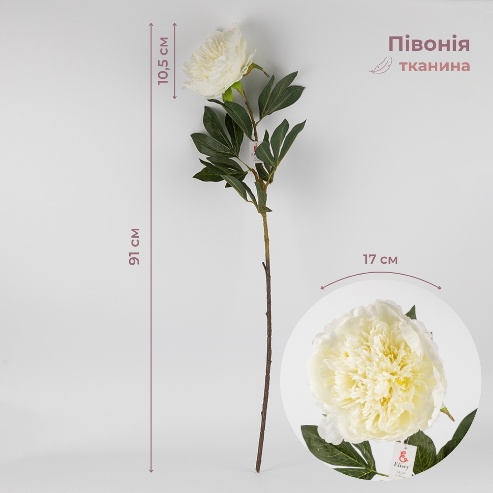 Высота - 91 см. Высота 1 бутона - 10, 5 см, диаметр - 17 см. Цветы изготовлены из ткани, стебли — из пластика. Искусственные пионы имеют детализированные листья и бутоны с природной текстурой и характерной формой. Гибкое стебло позволяет легко менять расположение, что делает их удобными для оформления интерьеров и флористических композиций. Подходят для создания декоративных аранжировок, озеленения помещений и фотозон.