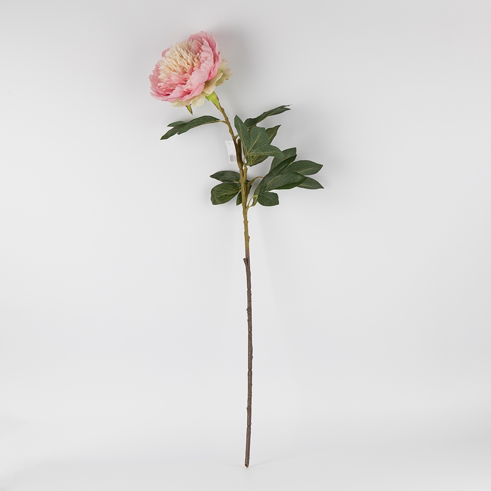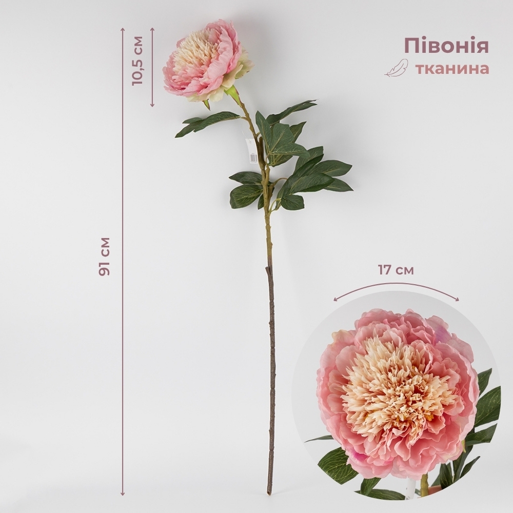 Высота - 92 см. Высота 1 бутона - 9 см, диаметр - 17 см. Цветы изготовлены из ткани, стебли — из пластика. Искусственные пионы имеют детализированные листья и бутоны с природной текстурой и характерной формой. Гибкое стебло позволяет легко менять расположение, что делает их удобными для оформления интерьеров и флористических композиций. Подходят для создания декоративных аранжировок, озеленения помещений и фотозон.
