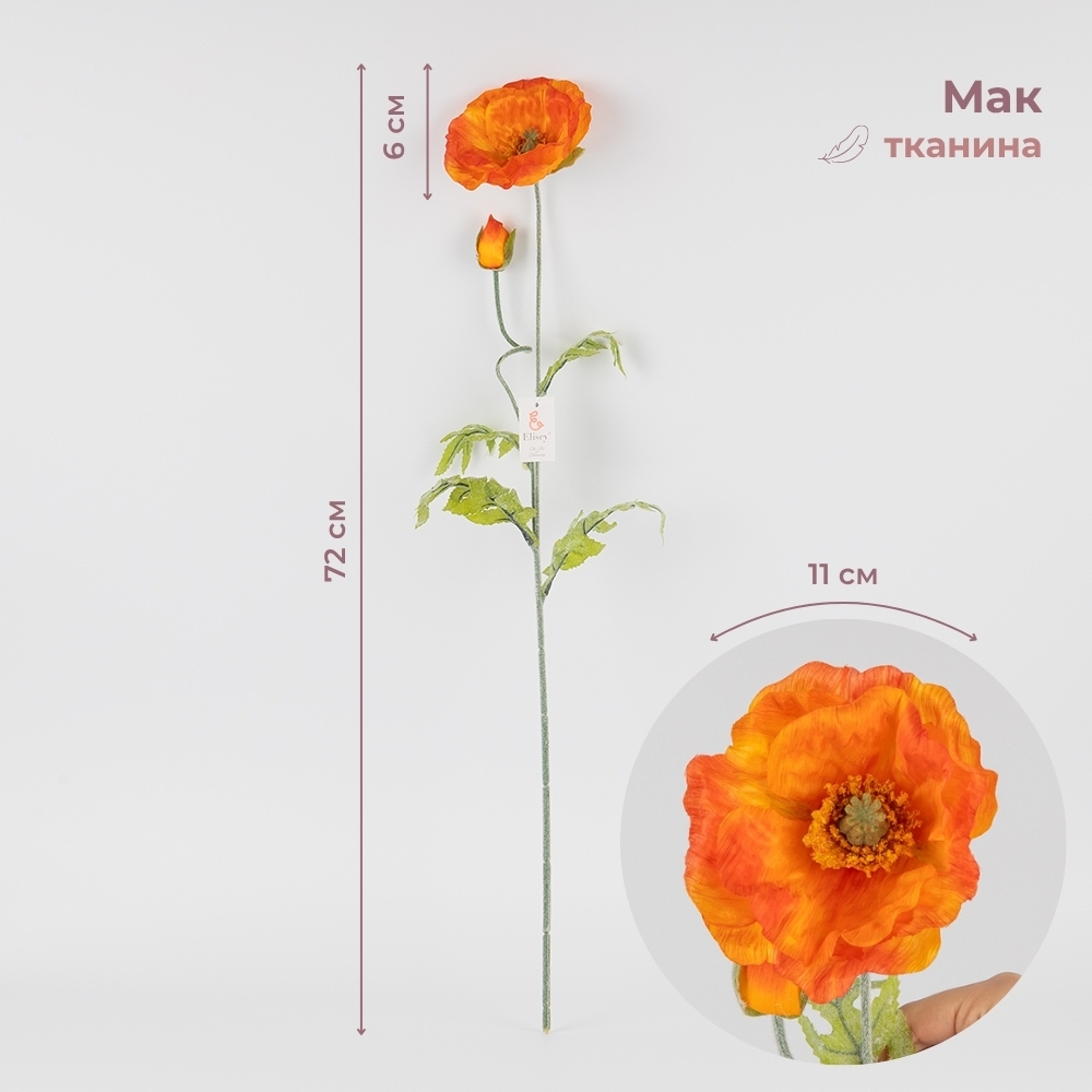 Высота - 72 см. Высота 1 бутона - 6 см, диаметр - 11 см. Искусственный мак - изысканный декоративный акцент с нежными лепестками и натуральным внешним видом. Благодаря гибкому стеблю и цветам, выполненых из ткани, идеально подходит для букетов, оформления фотозон, свадеб, витрин и интерьеров. Не требует ухода, надолго сохраняет привлекательный внешний вид.