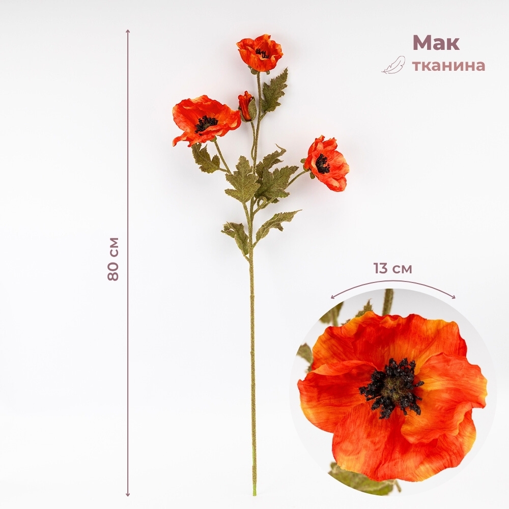 Высота – 80 см. Диаметр наибольшего бутона – 13 см. Искусственный мак – изысканный декоративный акцент с деликатными лепестками и натуральным видом. Благодаря гибкому стеблю и цветам, выполненным из ткани, идеально дополняет букеты, праздничные композиции, фотозоны, свадебный декор и сезонные витрины. Не требует ухода, долго сохраняет свой эстетический вид.
