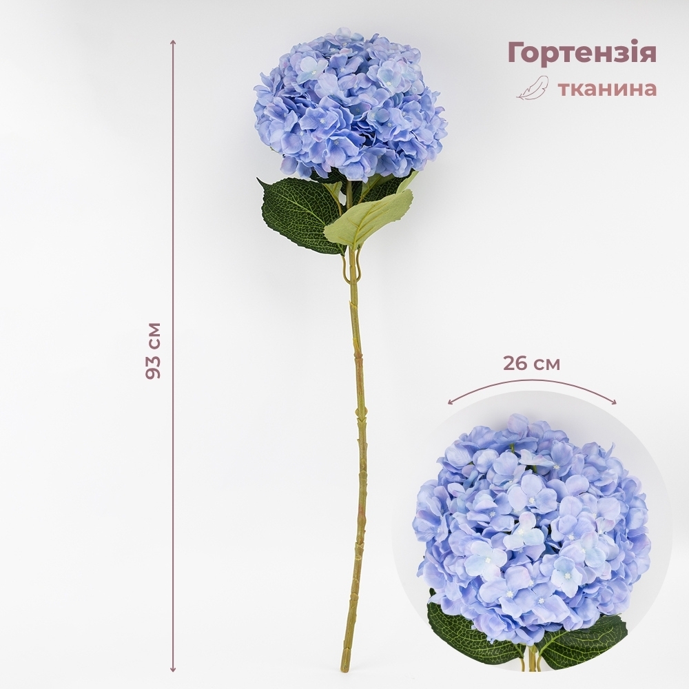 Высота – 93 см. Самый большой бутон на рынке: с диаметром 26 см, этот бутон создает эффект настоящего цветочного облака. Вам не понадобится много веток для создания WOW-эффекта! Бутон изготовлен из высококачественной ткани, точно имитирующей текстуру и форму настоящих лепестков. Искусственные гортензии – это отличный вариант для создания красивого и длительного декора без необходимости в постоянном уходе. Выглядят очень реалистично и имеют естественный вид, что придает привлекательности любому интерьеру или мероприятию. Они могут использоваться в букетах, композициях, а также для декорирования различных помещений, от дома до HoReCa.