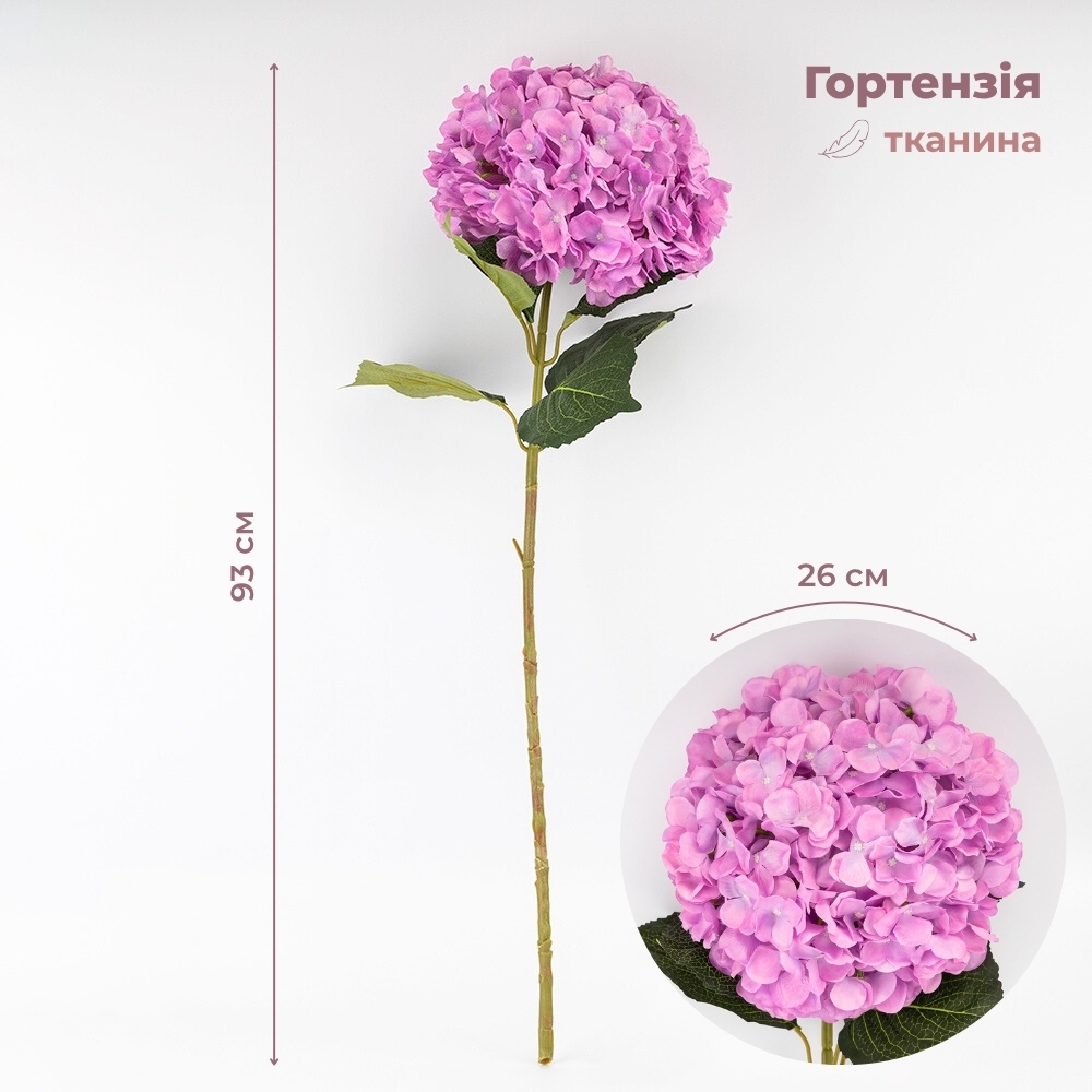 Высота – 93 см. Самый большой бутон на рынке: с диаметром 26 см, этот бутон создает эффект настоящего цветочного облака. Вам не понадобится много веток для создания WOW-эффекта! Бутон изготовлен из высококачественной ткани, точно имитирующей текстуру и форму настоящих лепестков. Искусственные гортензии – это отличный вариант для создания красивого и длительного декора без необходимости в постоянном уходе. Выглядят очень реалистично и имеют естественный вид, что придает привлекательности любому интерьеру или мероприятию. Они могут использоваться в букетах, композициях, а также для декорирования различных помещений, от дома до HoReCa.
