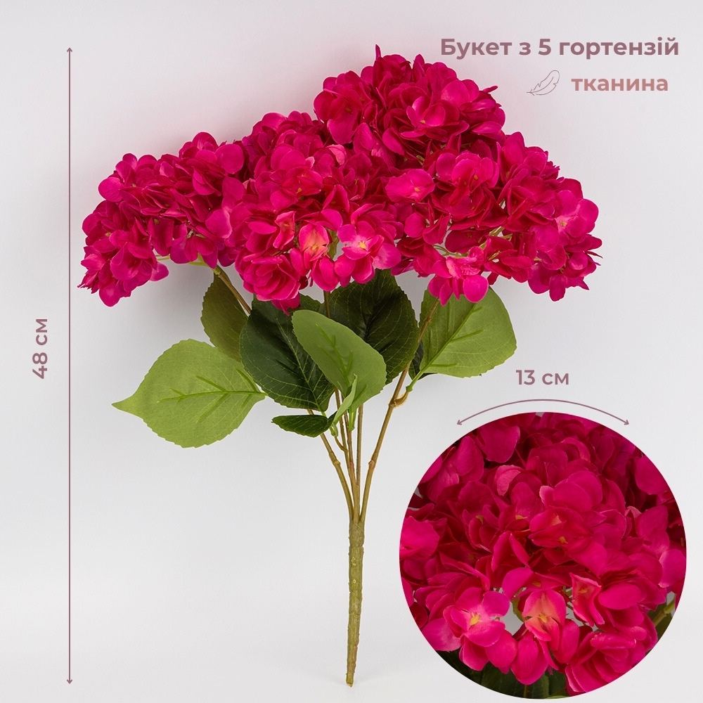 > Букет гортензий, 5 бутонов, ярко-розовый, 48 см (2026-008/plum red)