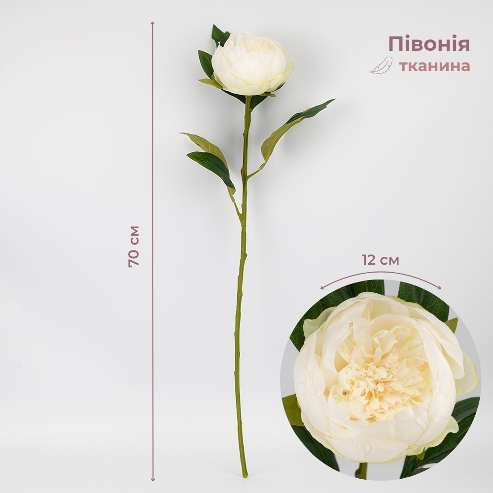 Высота - 70 см, диаметр бутона - 12 см. Цветы выполнены из ткани, стебли — из пластика. Искусственные пионы имеют детализированные листья и бутоны с природной текстурой и характерной формой. Гибкий стебель позволяет легко менять расположение и придавать цветку желаемую форму, что делает его удобным для оформления интерьеров и флористических композиций. Подходит для создания декоративных аранжировок, озеленения помещений и фотозон.