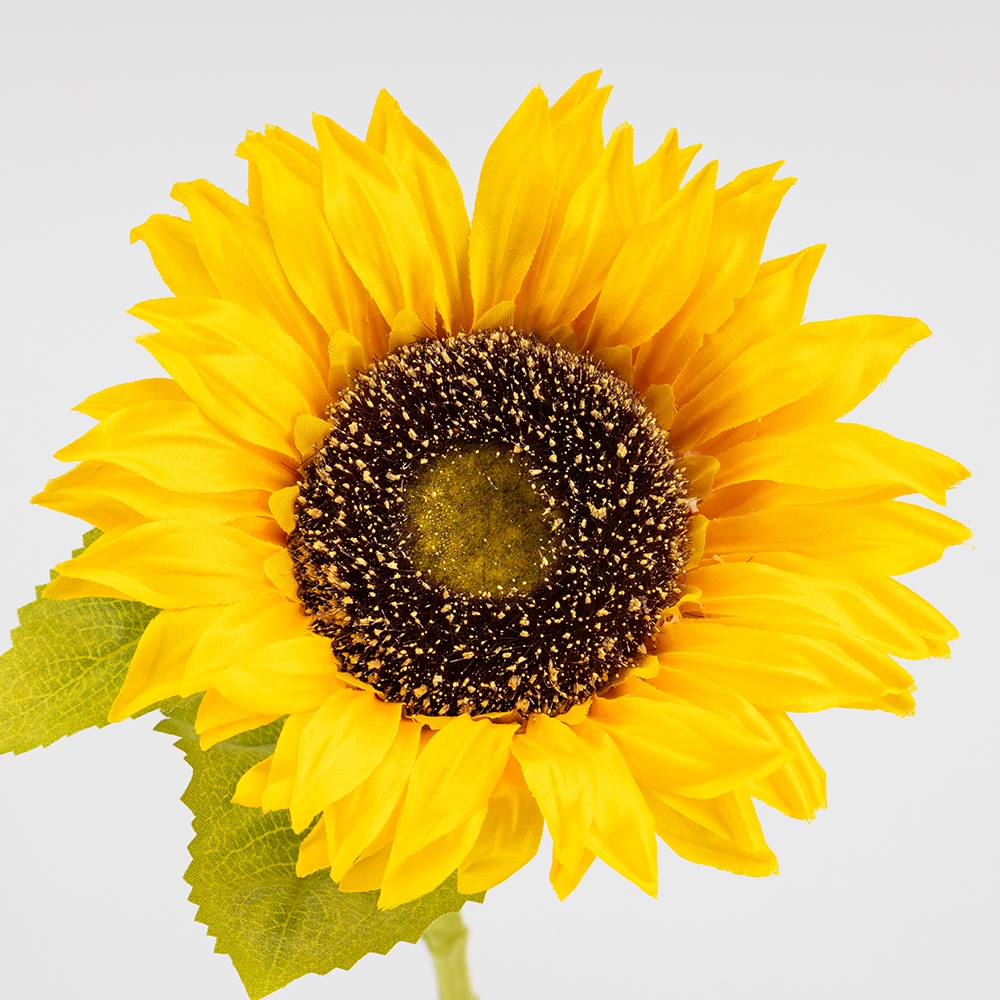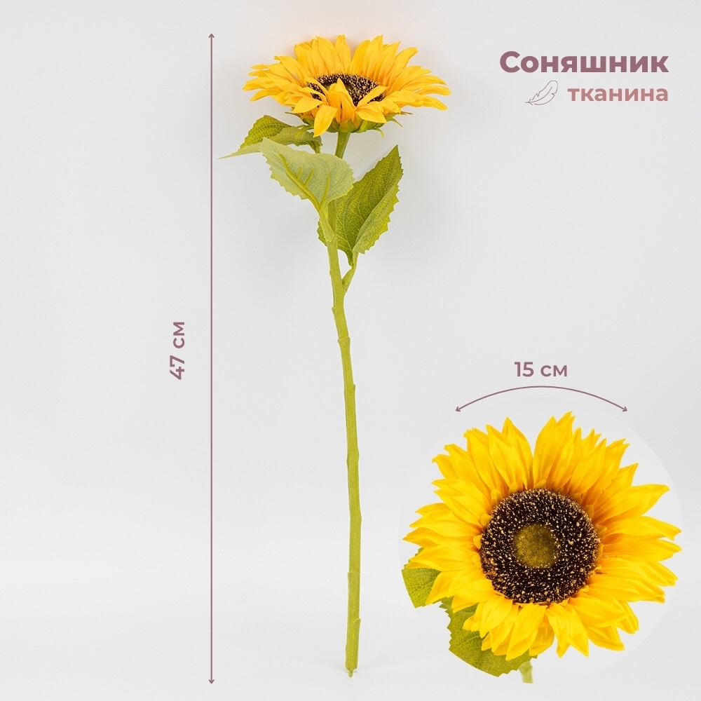 Высота – 47 см, диаметр подсолнуха – 15 см. Цветы и листья выполнены из ткани, стебли – из пластика. Искусственный подсолнух – это стильный и универсальный элемент декора, который сохраняет свою красоту без необходимости ухода. Его реалистичные лепестки, текстурированные листья и детально проработанная сердцевина создают эффект живого цветка. Благодаря крепкому стеблю его можно использовать как отдельно, так и в композициях для оформления интерьера или праздничных мероприятий.