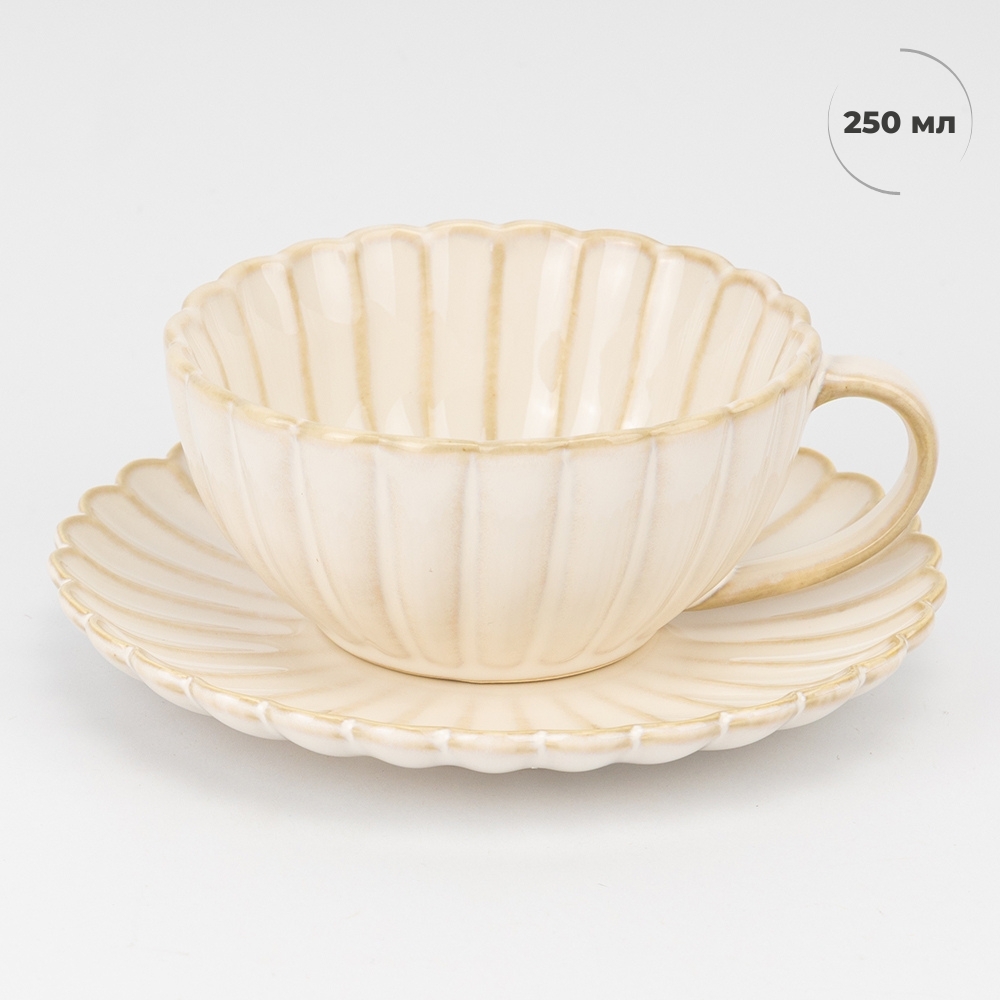 Объем - 250 мл. Высота - 5 см, диаметр - 10,5 см. Диаметр тарелки - 12 см. Элегантная чашка с блюдцем "Элеганс" - воплощение нежности и стиля. Перламутровое сияние керамики придает эстетике каждому глотку, а волнистые формы создают чувство гармонии. Идеальна для утреннего кофе или вечернего чая в красивой атмосфере.