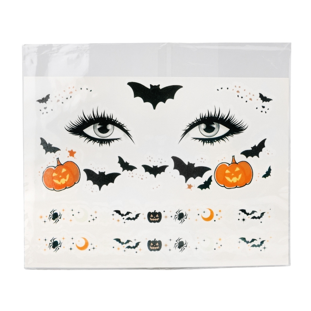 Тату размером от 1 до 8 см. Легкий и эффектный способ создать оригинальный праздничный макияж. В наборе – элементы для лица: летучие мыши, тыквы, пауки и звезды. Папу легко наносятся на кожу, держатся всю вечеринку и не вызывают раздражений. Прекрасный вариант для вечеринки, фотосессии или карнавала. Как использовать? Вырежьте выбранный рисунок и снимите защитную пленку. Приложите татуировку к коже липкой стороной вниз. Смочите бумагу водой, пока она хорошо не пропитается. Легко прижмите татуировку к коже на 10 секунд. Осторожно снимите бумагу – готово!