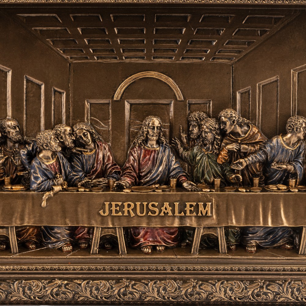 Высота – 16 см, длина – 27 см, ширина – 2 см. Картина Veronese изготовлена из полистоуна – искусственного камня. Упакована в подарочную коробку. Упаковка из пенопласта с индивидуальными углублениями для каждого элемента обеспечивает максимальную защиту товара при транспортировке. Это величественное панно-барельеф от Veronese является объемным воспроизведением одного из важнейших событий в христианстве — Тайной Вечери. Скульптурная композиция мастерски передает момент, когда Иисус Христос в последний раз собрался со своими двенадцатью апостолами в Иерусалиме. Барельеф выполнен из полистоуна и покрыт бронзовым напылением с цветными акцентами, придающими сцене драматизма и реализма. Благодаря встроенному креплению изделие легко размещается на стене как картина в рамке. Это знаковый подарок для верующих, символизирующий верность и оберег для дома.
