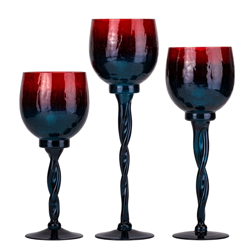 Набор стеклянных подсвечников включает 3 идентичных подсвечника разной высоты: 30 см, 35 см и 40 см. Диаметр – 10,8 см. Они могут использоваться не только совместно, но и отдельно. Высокая, тонкая ножка делает подсвечники изящными и компактными. Они кажутся почти невесомыми и не занимают много места, имея при этом непревзойденный вид. Такие подсвечники станут украшением праздничного стола на свадьбе, праздничном ужине, дне рождения и тематическом празднике, например Новом году. Отличный декор, который украсит фотозону, кафе, витрины магазинов.