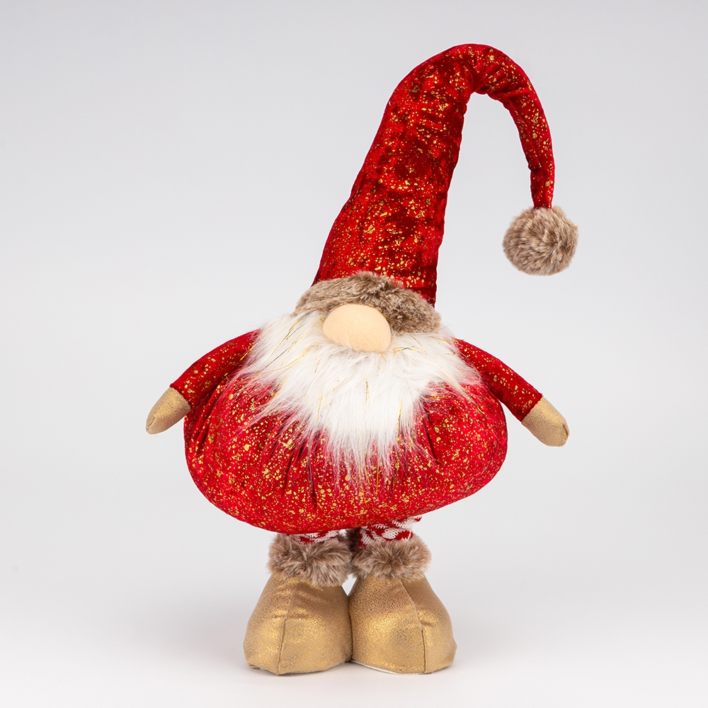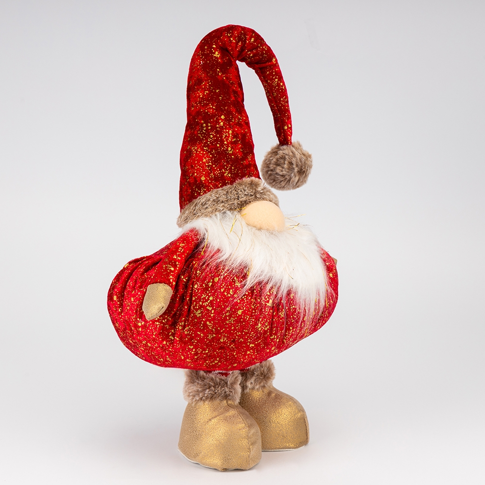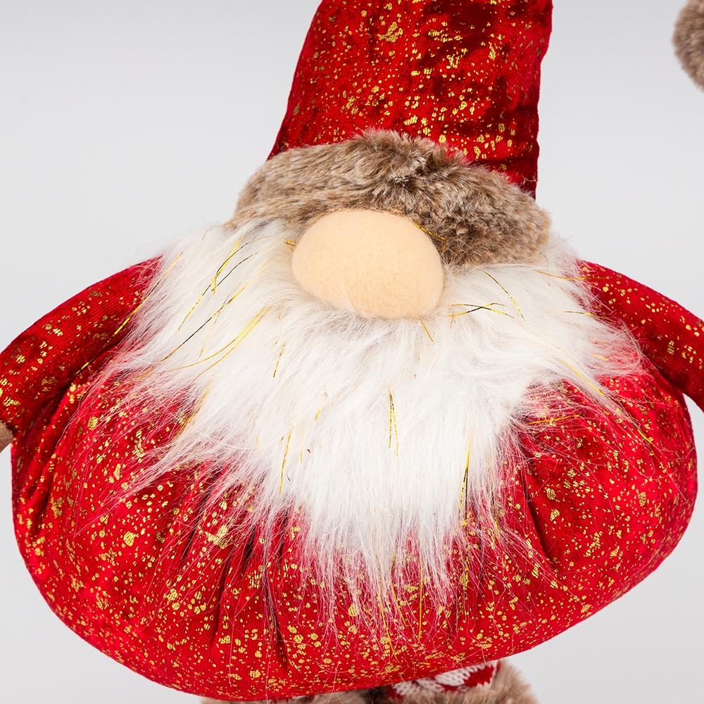 Высота - 60 см, ширина - 22 см. Высота фигурки с телескопическими ножками – от 38 до 56 см. Мягкая текстильная новогодняя игрушка – это волшебный декор для праздничного интерьера, изготовленный из мягких и приятных на ощупь материалов. Нежные цвета и детали придают ей особый шарм и праздничное настроение. Игрушка идеально подходит для украшения елки, камина или использования в качестве подарка, что принесет радость и уют в каждый дом. Фигурка стойко стоит.