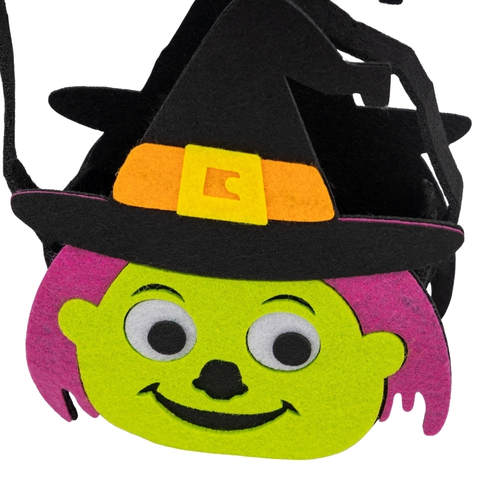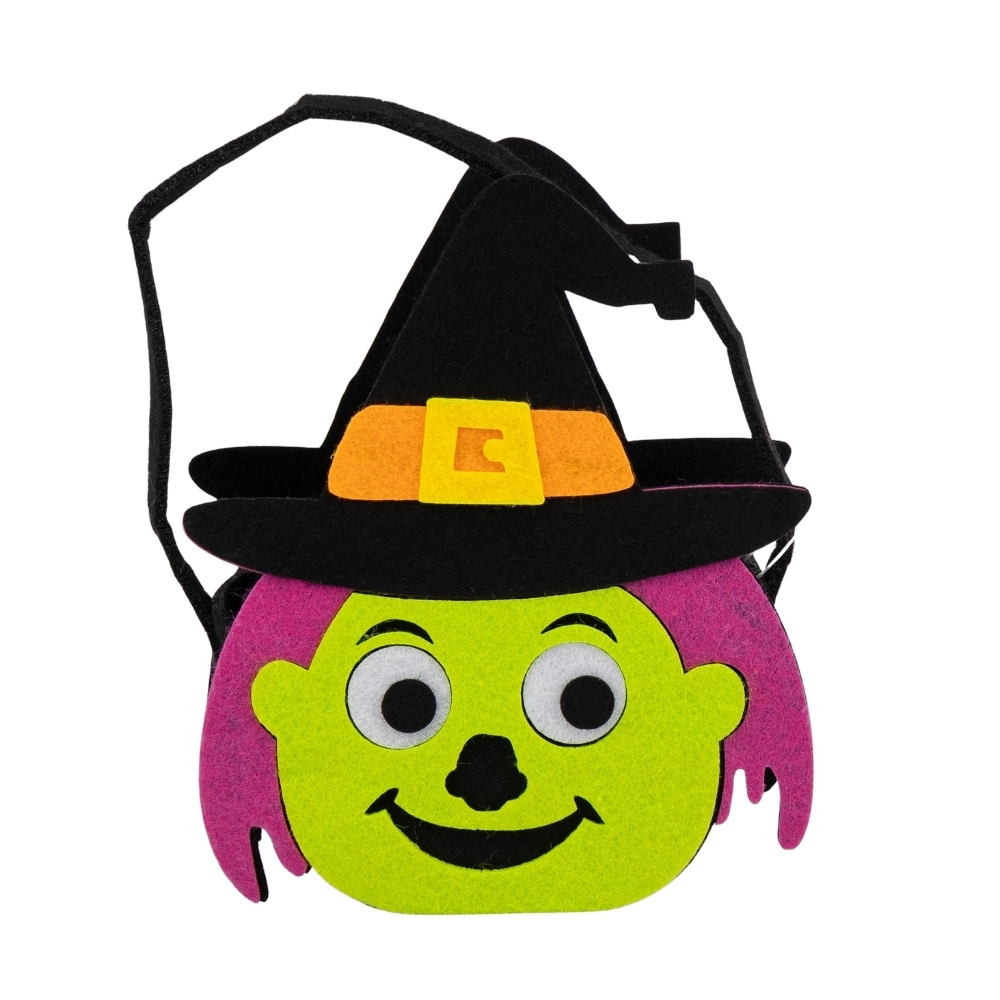 Высота с ручкой - 19 см, без ручки - 15,5 см. "Ведьмочка" — забавная фетровая корзинка в виде зелёной ведьмы. Идеальна для сбора сладостей, добавляет празднику волшебства. Удобна и лёгкая для детей.