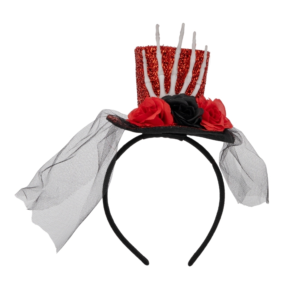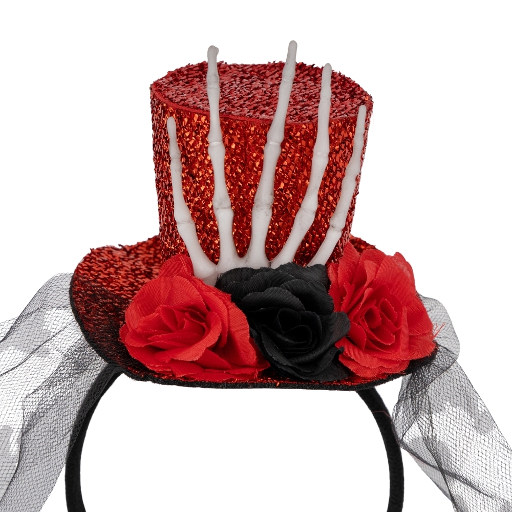 Длина – 23 см, диаметр – 11 см. Стильный карнавальный аксессуар в виде блестящей мини-шляпки с красными и черными цветами, сеткой и белой рукой-скелетом. Прекрасно дополнит образ ведьмы, вампирки или готической леди.