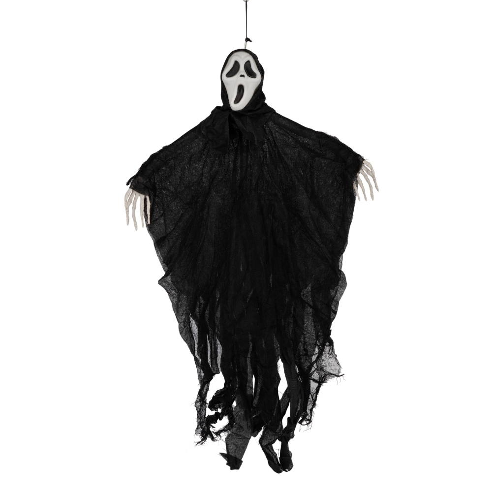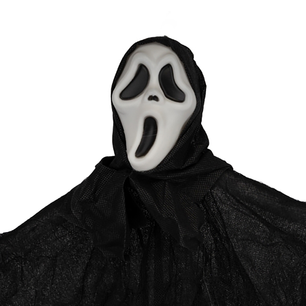 Длина – 60 см, ширина – 50 см. Классический черный призрак с культовой маской – беспроигрышный вариант для декора дома или вечеринки. Ткань эффектно развевается, а страшное лицо привидения дополняет атмосферу ужаса. Легко крепится благодаря веревке – украсьте дверь, потолок или сад.