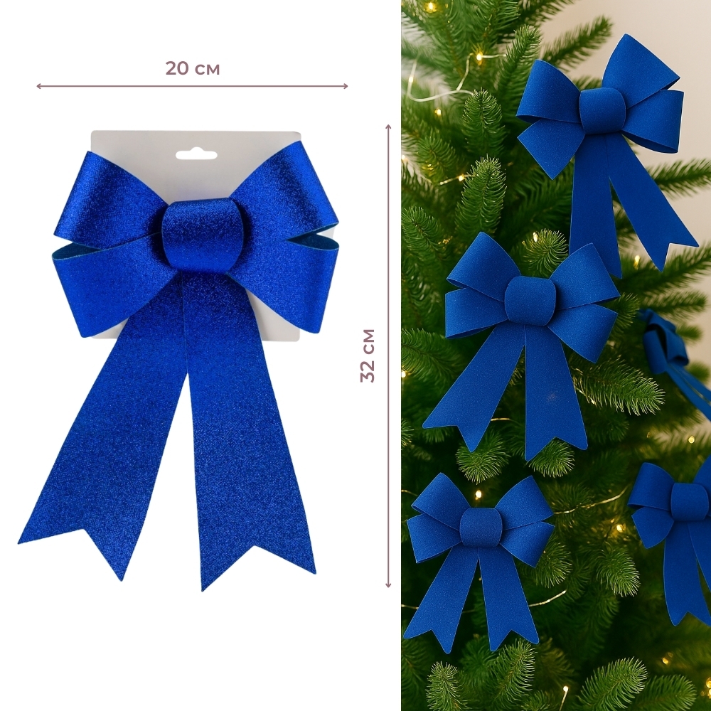 Новогодний бант — стильное украшение, которое станет ярким акцентом в праздничном декоре. Блестящая поверхность красиво отражает свет гирлянд, создавая ощущение тепла и торжественности. Банты можно использовать для украшения ёлки, дверей, окон или подарочных коробок — они везде будут выглядеть элегантно и празднично.