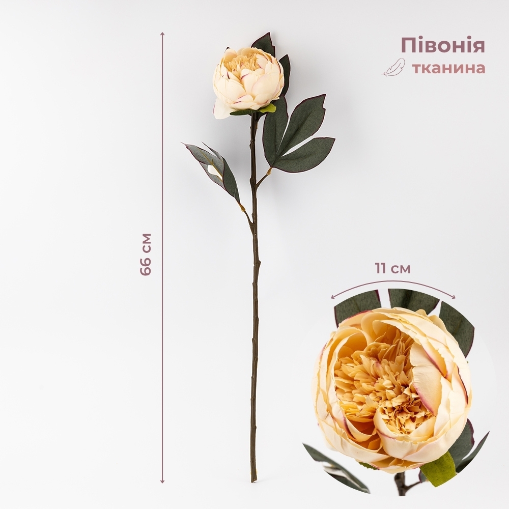 Высота - 66 см, диаметр бутона - 11 см. Цветы выполнены из ткани, стебли — из пластика. Искусственные пионы имеют детализированные листья и бутоны с природной текстурой и характерной формой. Гибкий стебель позволяет легко менять расположение и придавать цветку желаемую форму, что делает его удобным для оформления интерьеров и флористических композиций. Подходит для создания декоративных аранжировок, озеленения помещений и фотозон.