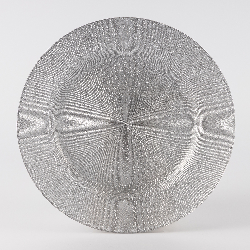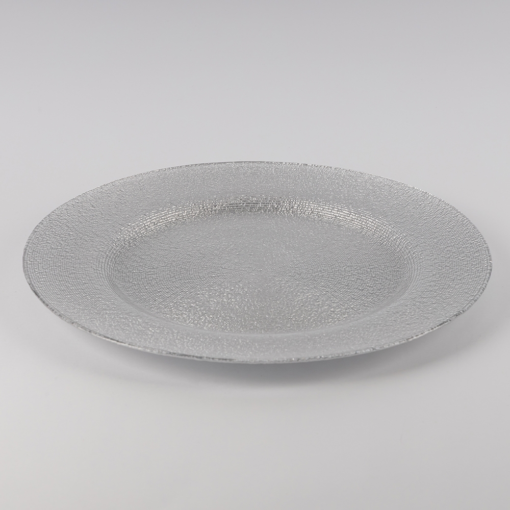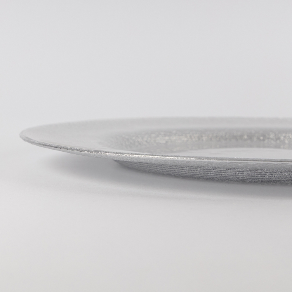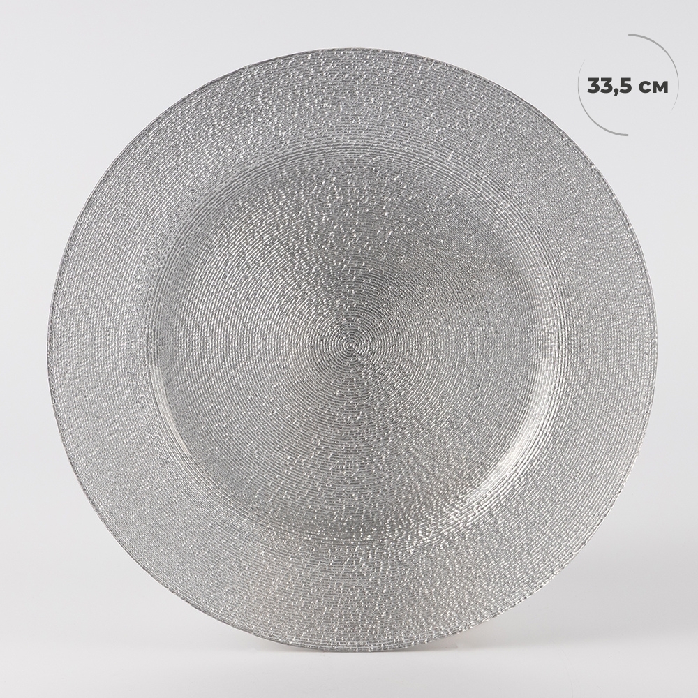 Диаметр тарелки – 33,5 см, высота - 2,5 см. Декоративная стеклянная тарелка серебристого цвета с роскошным блеском. Её холодное сияние прекрасно сочетается с праздничным текстилем и декором, добавляя элегантности вашей сервировке. Отличный выбор для свадеб, юбилеев и утончённых мероприятий в светлой палитре.