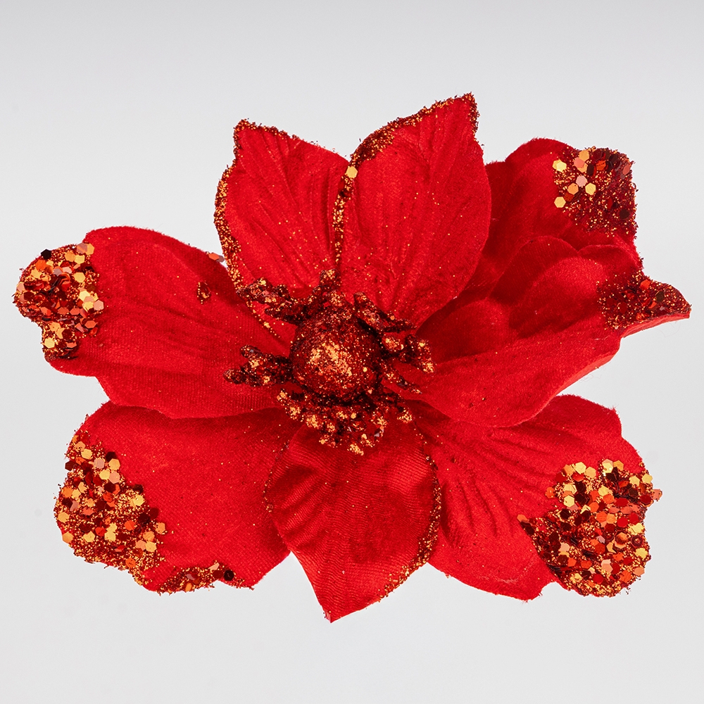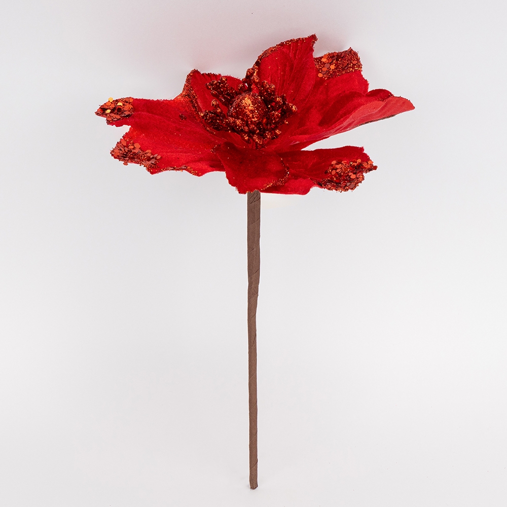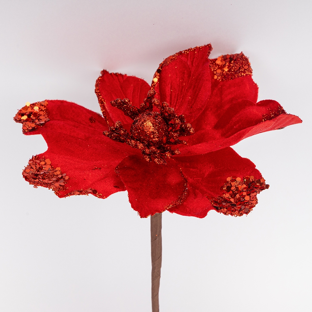 Высота – 25 см, диаметр – 18 см. Лепестки гибкие. Декоративный яркий цветок Пуансетия – это эффектный элемент праздничного декора, привлекающий внимание своим роскошным сиянием и утонченным дизайном. Лепестки, покрытые блестками, переливаются в свете, создавая яркое мерцание, придающее цветку элегантность и праздничное настроение. Такой цветок станет прекрасным дополнением к праздничным венкам, елочным украшениям или центральным композициям на столе. Она идеально подойдет для украшения фотозон, праздничных интерьеров или для добавления роскоши в любую новогоднюю композицию.