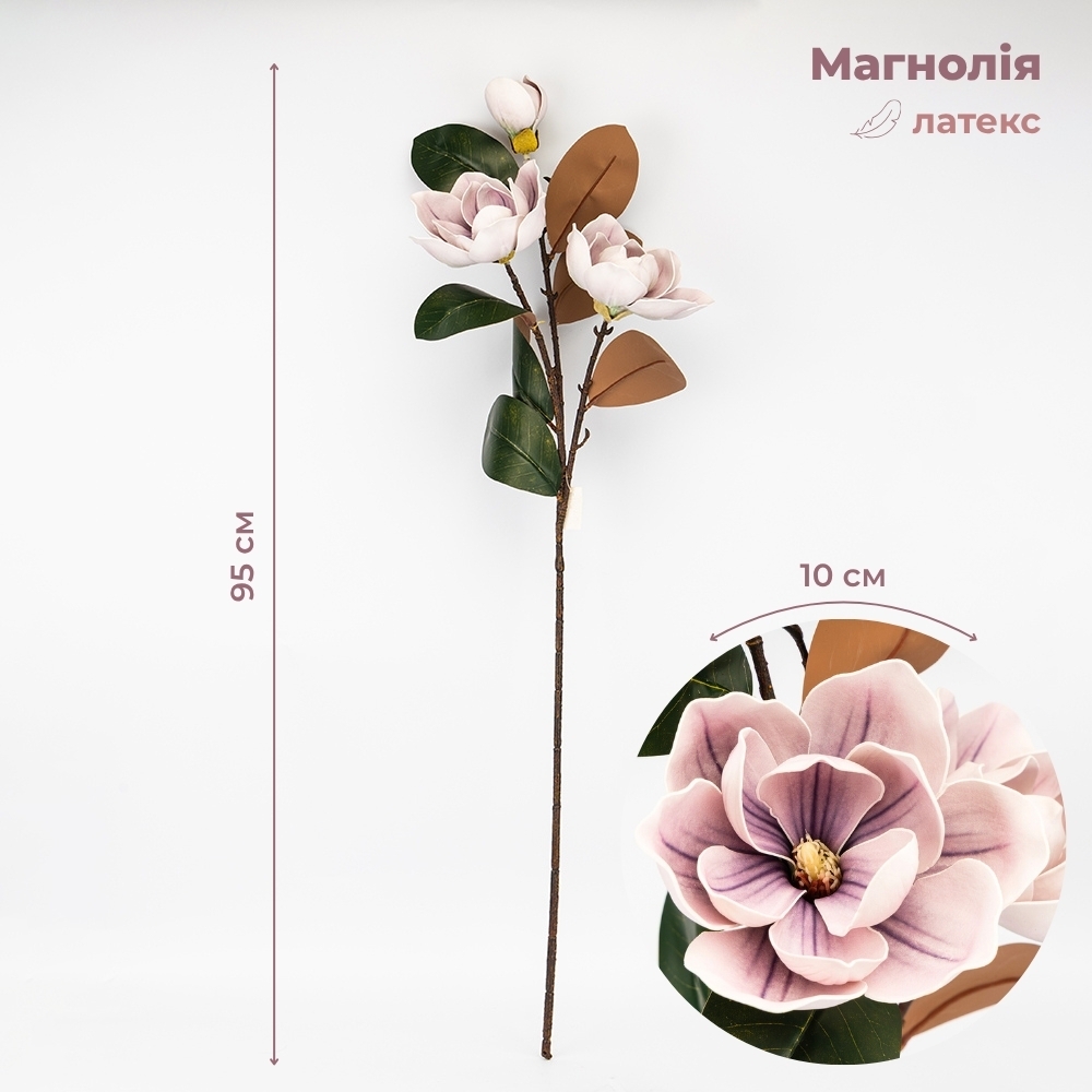 Обратите внимание, что в результате недавней атаки дронов часть партии обладает ароматом гари, который полностью выветривается в течение определенного времени. Высота – 95 см, диаметр наибольшего бутона – 10 см. Латексная магнолия – это идеальное решение для создания изысканных и долговечных флористических композиций. Благодаря реалистичному покрытию лепестков и детализированной структуре бутонов цветок не отличается от живого. Изящная ветвь имеет дополнительные стильные темно-коричневые листья, придающие объему и естественности. Эта искусственная магнолия не нуждается в уходе и сохранит свой первоначальный вид в течение многих лет. Создайте атмосферу весеннего сада в вашем интерьере уже сегодня.