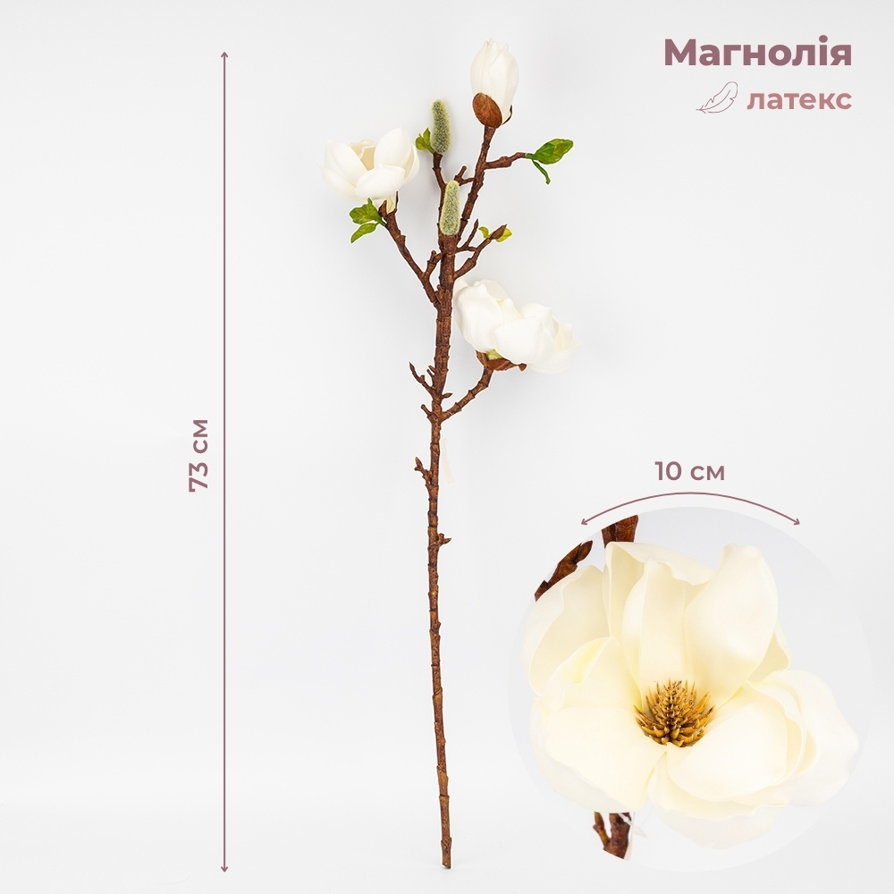 Обратите внимание, что в результате недавней атаки дронов часть партии обладает ароматом гари, который полностью выветривается в течение определенного времени. Высота – 73 см, диаметр наибольшего бутона – 10 см, наименьшего – 4 см. Латексная магнолия – это идеальное решение для создания изысканных и долговечных флористических композиций. Благодаря реалистичному покрытию лепестков и детализированной структуре бутонов цветок не отличается от живого. Изящная ветвь имеет дополнительные стильные темно-коричневые листья, придающие объему и естественности. Эта искусственная магнолия не нуждается в уходе и сохранит свой первоначальный вид в течение многих лет. Создайте атмосферу весеннего сада в вашем интерьере уже сегодня.