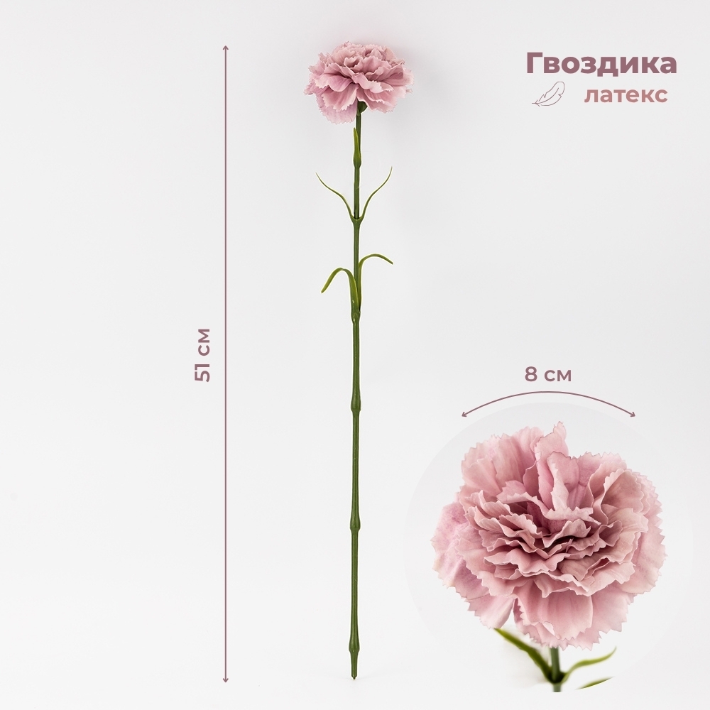 Высота – 51 см, диаметр бутона – 8 см. Искусственная гвоздика из латекса отличается нежной формой цветов и детализированными лепестками. Благодаря естественному виду и плотному объему цветов она станет удачным акцентом в любом интерьере. Идеально подходит для украшения залов, оформления фотозон и создания цветочных композиций. Гармонично дополнит как классический, так и современный стиль оформления.