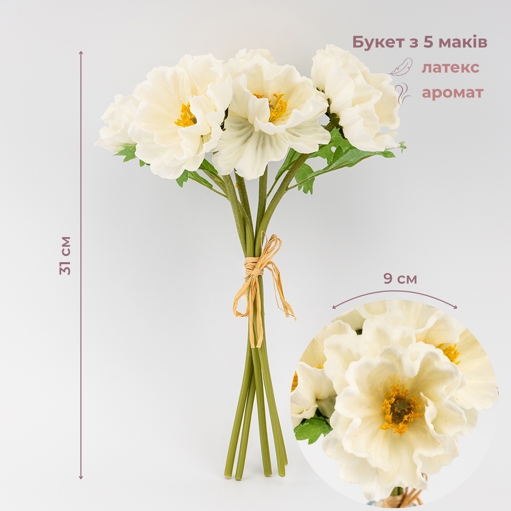 Букет маков, 5 бутонов, белый, 31 см (9259-144)