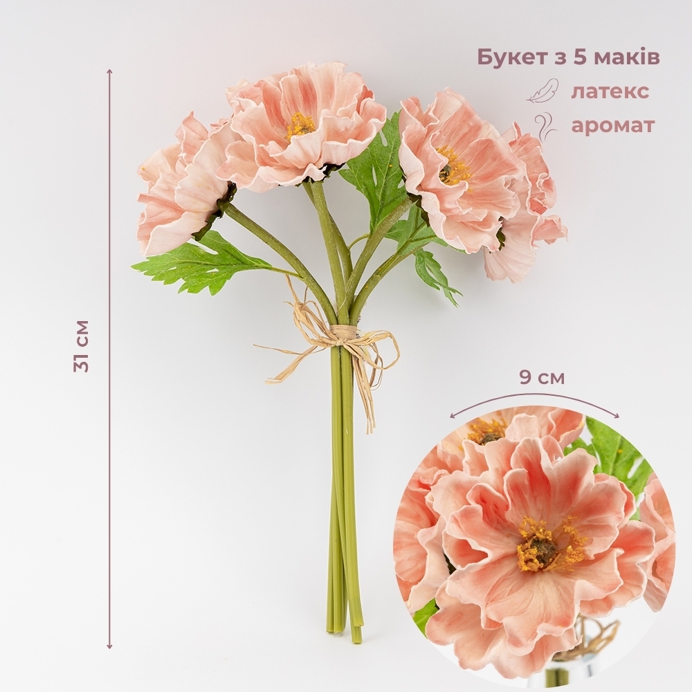 Маки с нежным цветочным ароматом! Высота – 31 см, диаметр бутона – 9 см. В букете 5 маков. Цветы выполнены из латекса, листья – из ткани, стебли – из пластика. Стебли гибкие. Этот искусственный букет маков сочетает утонченность и естественную красоту, создавая эффект свежесрезанных цветов. Его нежные лепестки дополняются изящными листьями, а композиция выглядит гармоничной и элегантной. Букет обладает легким цветочным ароматом, что придает ему еще большую реалистичность. Идеально подходит для декора интерьера, фотозон или праздничных композиций.