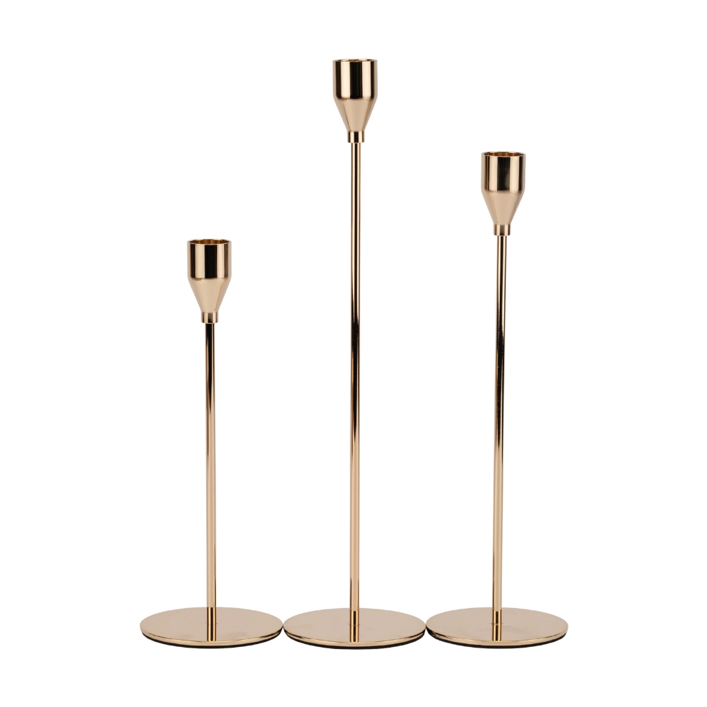 Высота наибольшего подсвечника – 32 см, среднего – 27 см, наименьшего – 22 см. Ширина подставки – 8 см, диаметр подсвечников – 2,5 см. Набор упакован в разобранном виде в пенопласт и крафтовую картонную коробку. Сборная конструкция достаточно легкая: детали вкручиваются друг в друга. Набор металлических подсвечников для декорирования включает 3 идентичных подсвечника разной высоты. Они могут использоваться не только совместно, но и по отдельности. Высокая, тонкая ножка делает свечные подставки очень изящными и компактными. Каждый подсвечник имеет мягкую подкладку на стойкой основе. Элегантные металлические подсвечники – стильный и декоративный элемент, который можно использовать в ресторанах, на свадебных церемониях, гостиницах, в домашнем интерьере и других местах для создания элегантного и атмосферного освещения.