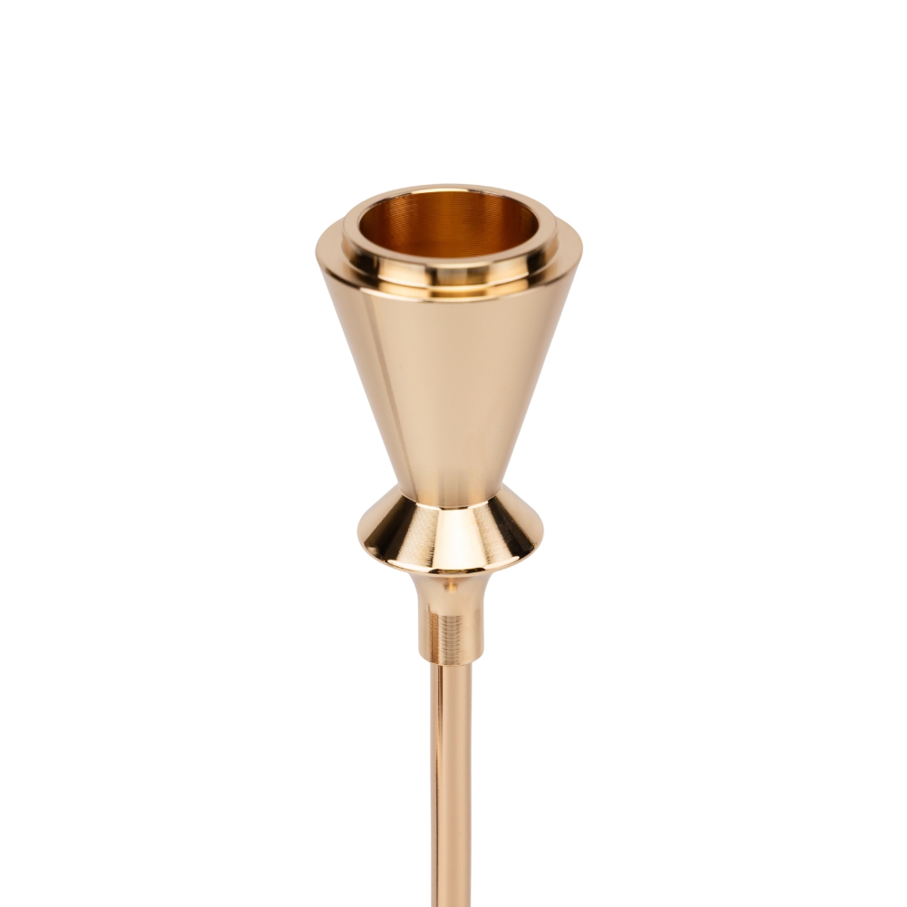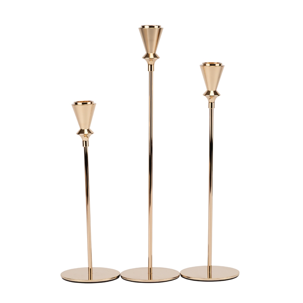 Высота наибольшего подсвечника – 33,5 см, среднего – 28,5 см, наименьшего – 24 см. Ширина подставки – 8 см, диаметр подсвечников – 3,5 см. Набор упакован в разобранном виде в пенопласт и крафтовую картонную коробку. Сборная конструкция достаточно легкая: детали вкручиваются друг в друга. Набор металлических подсвечников для декорирования включает 3 идентичных подсвечника разной высоты. Они могут использоваться не только совместно, но и по отдельности. Высокая, тонкая ножка делает свечные подставки очень изящными и компактными. Каждый подсвечник имеет мягкую подкладку на стойкой основе. Элегантные металлические подсвечники – стильный и декоративный элемент, который можно использовать в ресторанах, на свадебных церемониях, гостиницах, в домашнем интерьере и других местах для создания элегантного и атмосферного освещения.