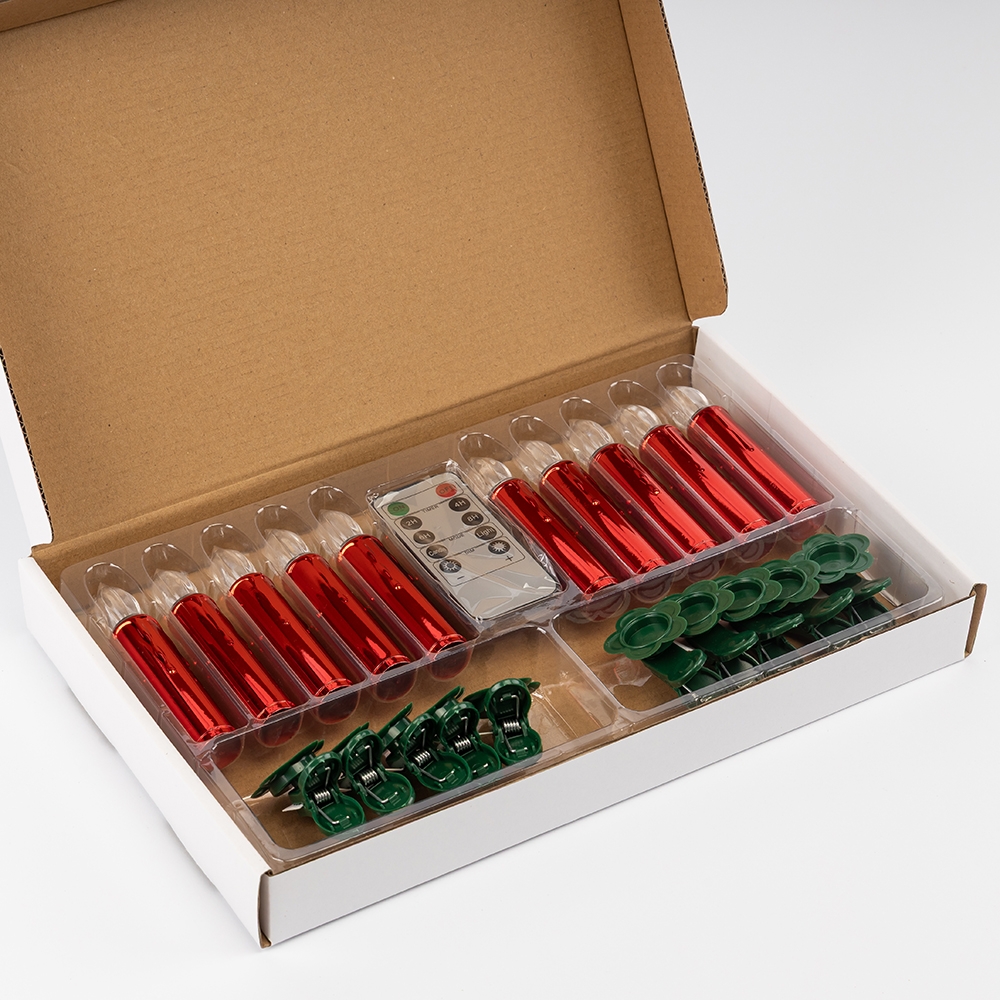 Высота с прищепкой — 12 см, без прищепки — 10 см, диаметр — 2 см. Светодиодные свечи легко крепятся с помощью надёжных прищепок — можно зафиксировать их на ёлке, гирляндах, венках или любом другом декоре. С помощью пульта дистанционного управления удобно регулировать яркость и режимы. Идеальное решение для праздничного декора — тёплый, уютный свет, который не мерцает и создаёт настоящую атмосферу рождественского уюта.