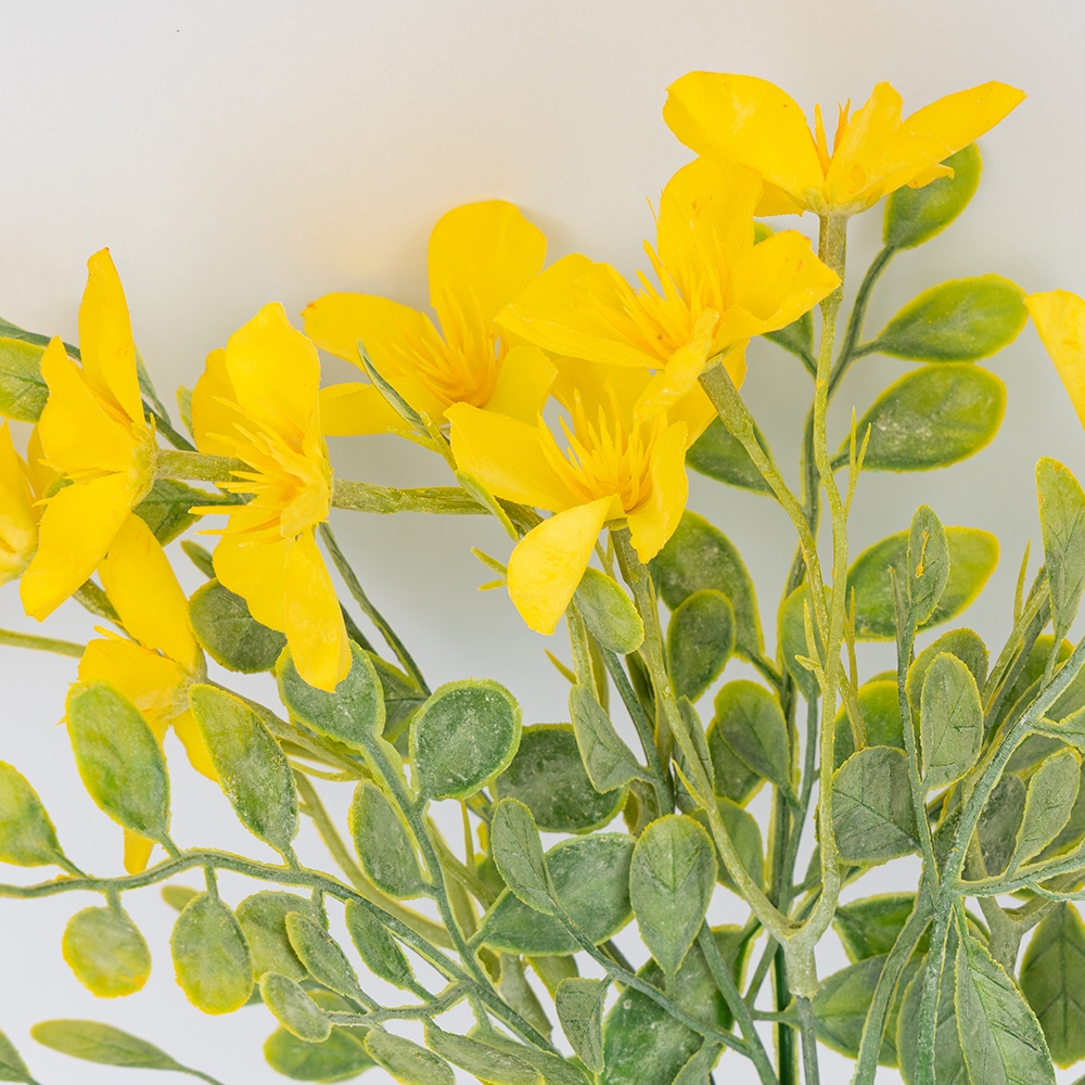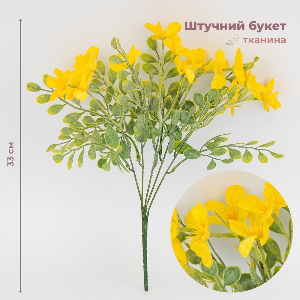 Высота – 33 см. Изысканный искусственный букет с реалистичными цветами желтого цвета и декоративной зеленью смотрится естественно и элегантно. Идеален для оформления интерьера, создания праздничной атмосферы или стильной фотозоны. Долговечные материалы гарантируют сохранность безупречного вида без специального ухода.