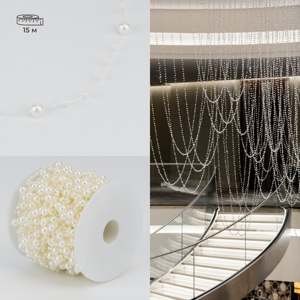 Декоративная гирлянда из жемчужин на леске — стильный элемент для праздничного оформления и интерьерного декора. Она идеально подходит для украшения свадьбы, дня рождения, фотозоны, праздничного стола или витрины. Благодаря прозрачной основе создаётся эффект парящих бусин, что придаёт композиции лёгкость и изящество. Гирлянда легко режется на отрезки нужной длины и гармонично сочетается с цветочными композициями, свечами, текстилем и другими элементами декора. Это универсальное решение, которое добавляет утончённости любому празднику или интерьеру.