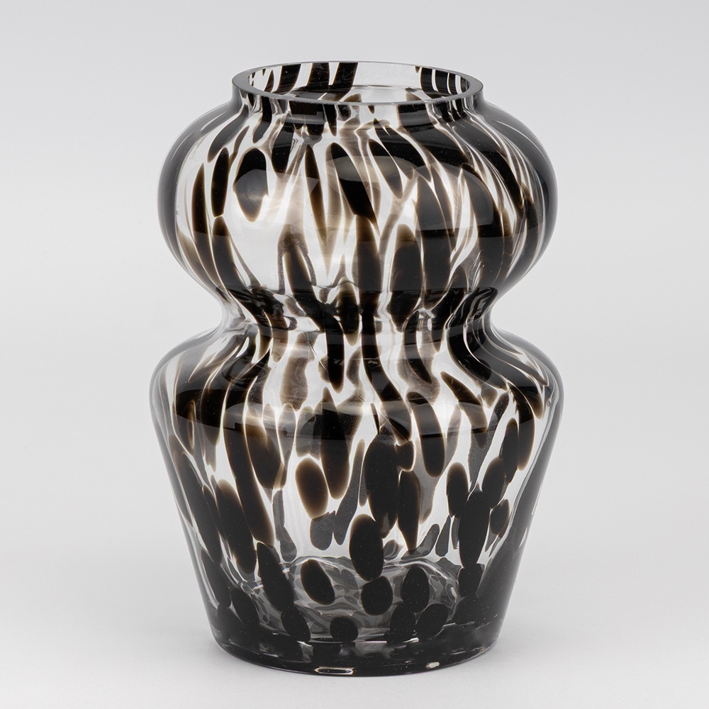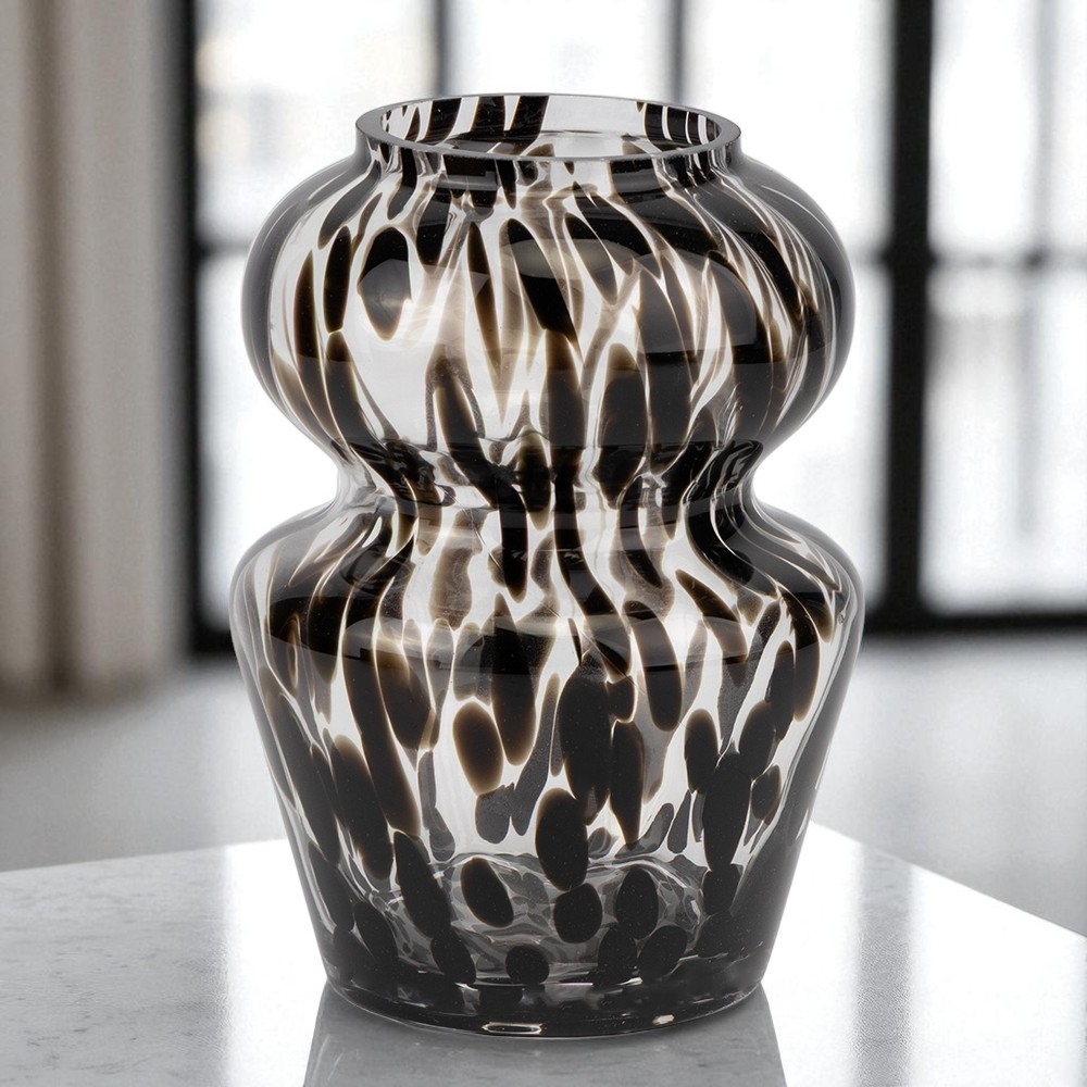 Высота - 20 см, диаметр - 14 см. Диаметр горлышка - 9 см. Эта стеклянная ваза выполнена в уникальной технике с эффектом капель и плавных цветовых переходов. Она сочетает в себе элегантность ручной работы и современный дизайн, становясь ярким акцентом в любом интерьере. Благодаря своей форме и узору ваза подчёркивает красоту цветочных композиций или может служить самостоятельным декоративным элементом. Такая ваза идеально подойдёт для дома, ресторанов, отелей или стильных фотозон.