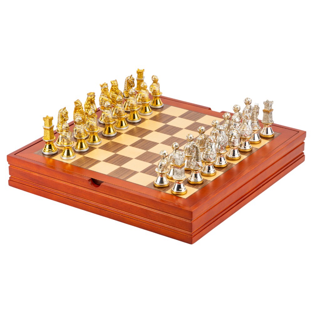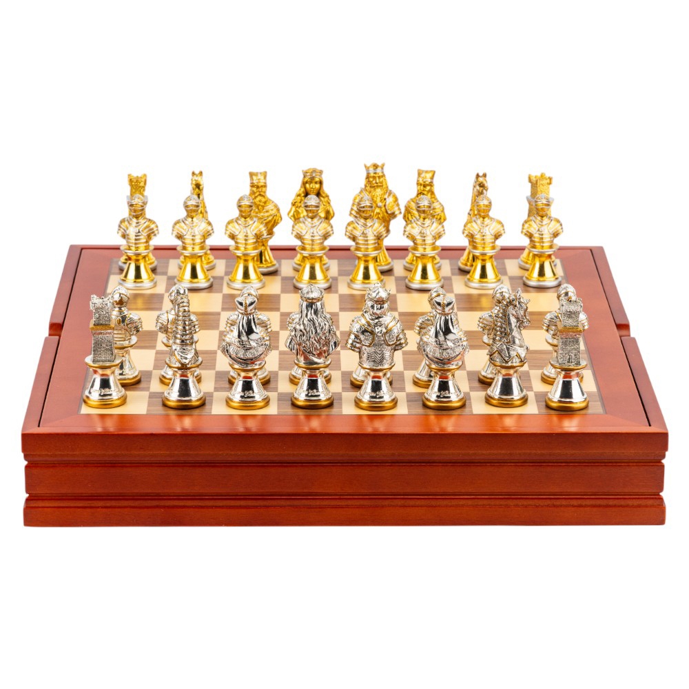 Высота доски – 6 см, длина – 37 см. Высота фигур – до 6 см. Упаковка из пенопласта с индивидуальными углублениями для каждого элемента обеспечивает максимальную защиту товара при транспортировке. Погрузитесь в мир средневековых баталий с этим эксклюзивным шахматным набором "Рыцарская Эпоха". Фигуры выполнены в виде стилизованных средневековых персонажей с изысканной детализацией и роскошным золотистым и серебристым покрытием. Доска изготовлена из полированного дерева насыщенного оттенка и имеет удобную складную конструкцию, служащую ящиком для хранения фигур. Этот набор идеально сочетает эстетическое удовольствие от коллекционного изделия и удовольствие от классической игры. Он станет отличным дополнением интерьера и идеальным подарком для ценителей элегантности и стратегии.